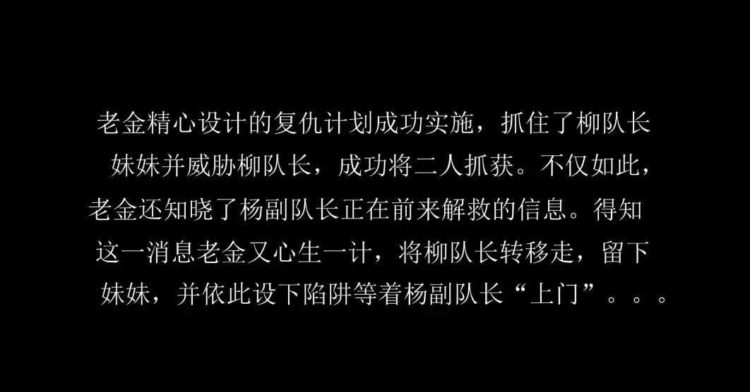 杨副队长得知消息后便开始寻找柳队长姐妹。一番寻找后在老金电脑中发现了信息和证据。后来杨副队长终于找到了妹妹,杨副队长发现,妹妹居然被换上了柳队长的衣服。更没想到的是,这一切都在老金的计算之中,目的就是为了让她掉入“陷阱”。深陷陷阱的杨副队长和作为诱饵的妹妹遭遇了老金各种新花样地折磨。最后柳队长、杨副队长和妹妹三人的结局又会如何呢......