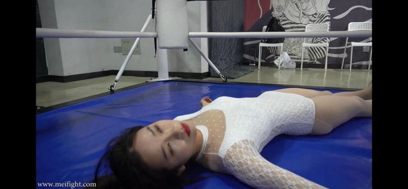 白色制服丝袜美女和男子对决,被全程蹂躏并摆出各种羞耻姿势,最终战败失去意识,昏迷不醒。