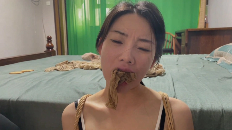 挑战二:柳洋规定时间内成功吃到被丝袜团包裹的饼干。(这个挑战难点在丝袜堵嘴+泡棉胶带封嘴,效果非常好,像柳洋这么有经验的模特,也依然没有挑战成功,泡棉胶带yyds)