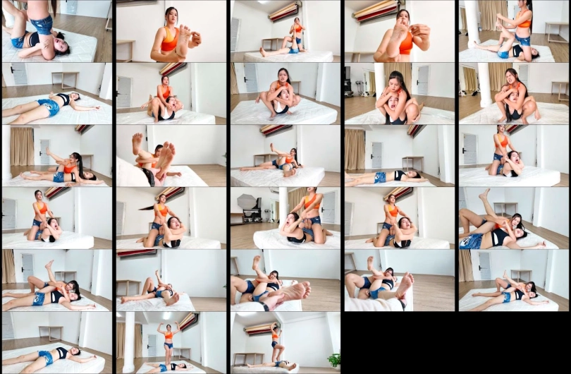 Julie (orange top) completely dominates and destroys poor Suki with various wrestling moves and humiliates Suki