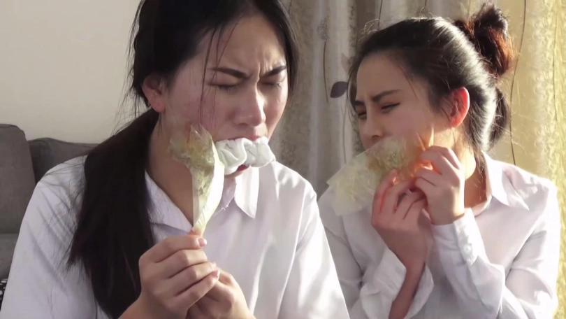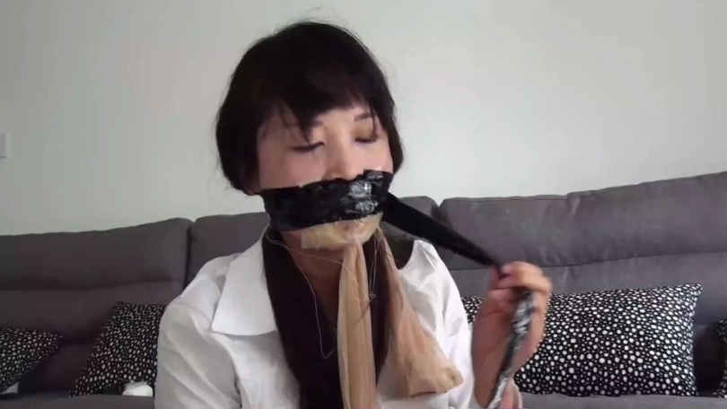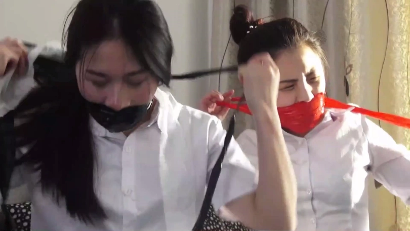 (五)被反派捆堵折磨的刘娜孙甜两位美女互相配合解除对方束缚,一点点撕掉封嘴纱布胶带还有嘴外透明胶带,分别拽出口中棉袜和短丝袜大口喘气。