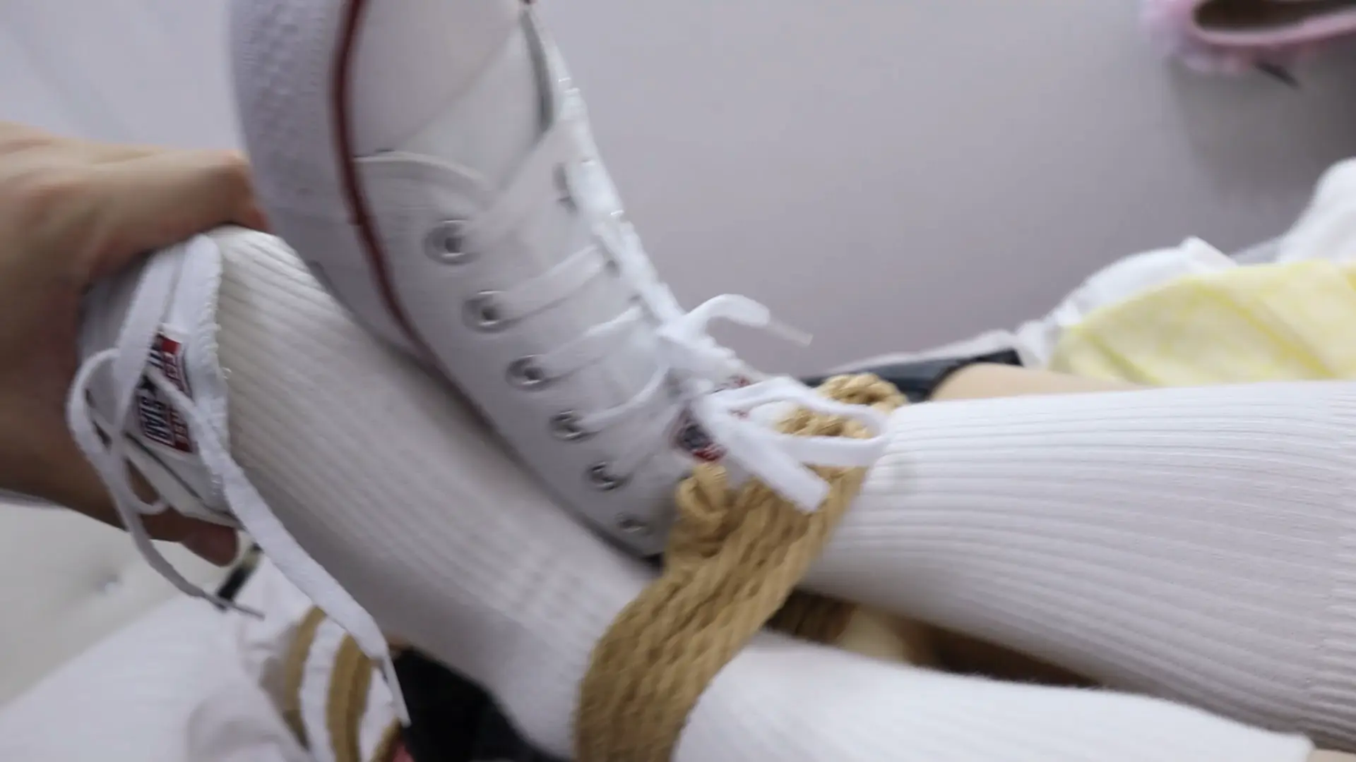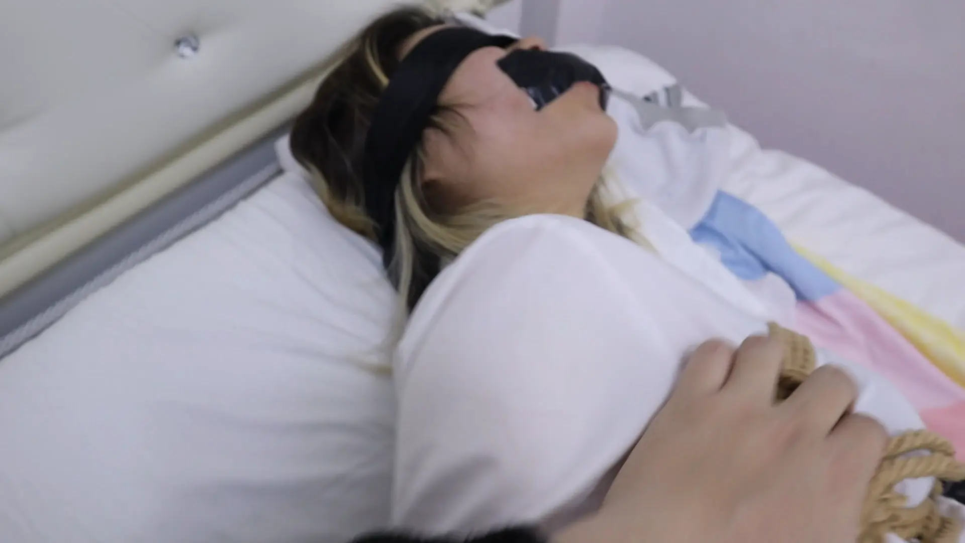 强行把布条完整塞入少女H嘴里塞满并用胶带封住,双手粉铐撩绳子拉住脚上的绳子弯曲腿部,