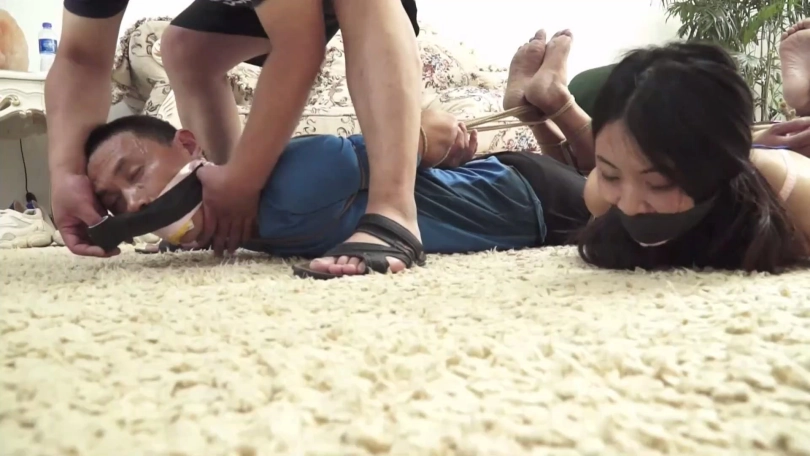 片段1:回家的美女夏炎看到老公锁哥被绑,还以为老公跟自己开玩笑玩游戏,被潜入家中的入室劫匪捂嘴劫持后被迫脱掉自己脚上穿了好几天没洗的一双白色锦纶丝袜塞到锁哥嘴里,而后劫匪将夏炎捆绑后脱掉锁哥脚上穿的一双脏兮兮的肉色锦纶丝袜塞到夏炎嘴里,用黄胶布封嘴后,二人挣扎逃脱未遂被捆成驷马,劫匪用粉色胶带和黑色自粘绷带在二人嘴外沿脑后来回缠绕多圈,把他们嘴封堵得严严实实。
