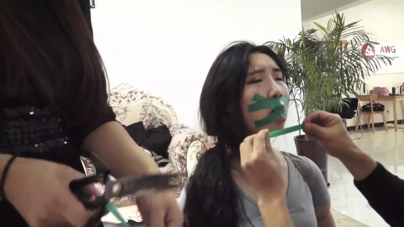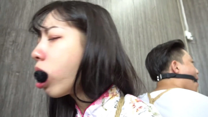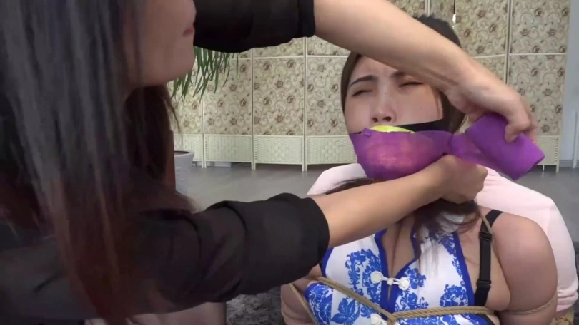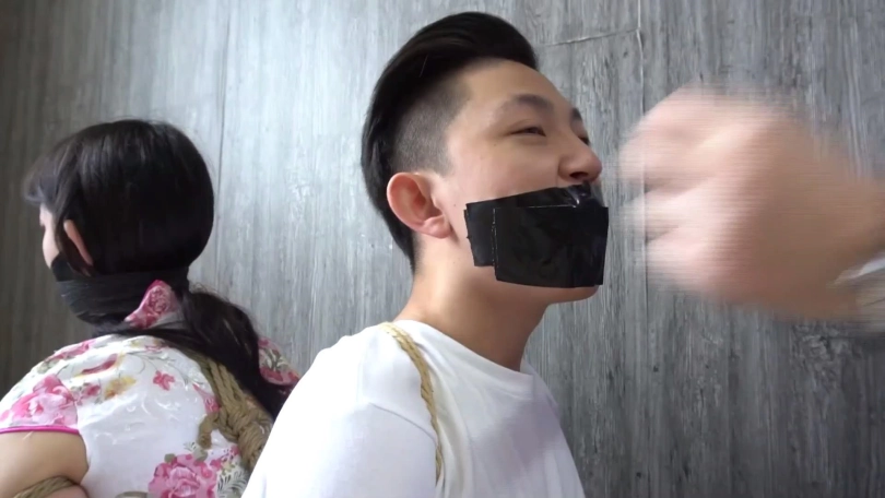 片段6:美女冷兮和男友被反派劫持驷马捆绑,用丝巾塞嘴后胶布胶带绷带缠绕封嘴。