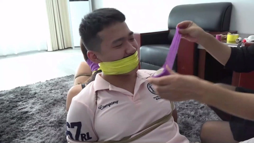 片段3:逃脱未遂的吴晗与自己男友被李然和锁哥擒获,锁哥和李然分别脱掉自己穿的原味臭锦纶丝袜和黑色连裤丝袜塞到吴晗和吴晗男友嘴里,再用绿色胶带一条条封在他们嘴外,黑色胶带与紫色弹力自粘绷带来回沿二人脑后缠绕封嘴。