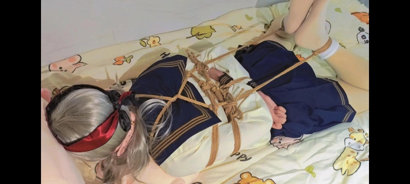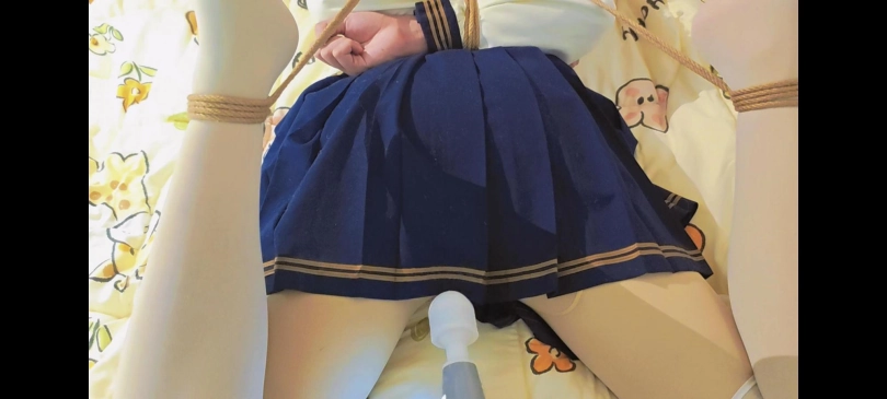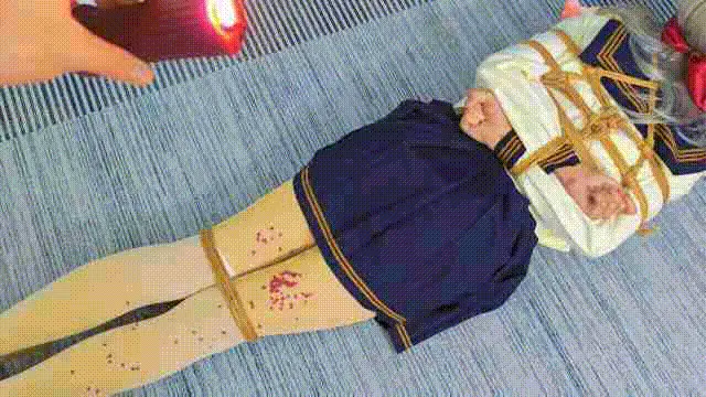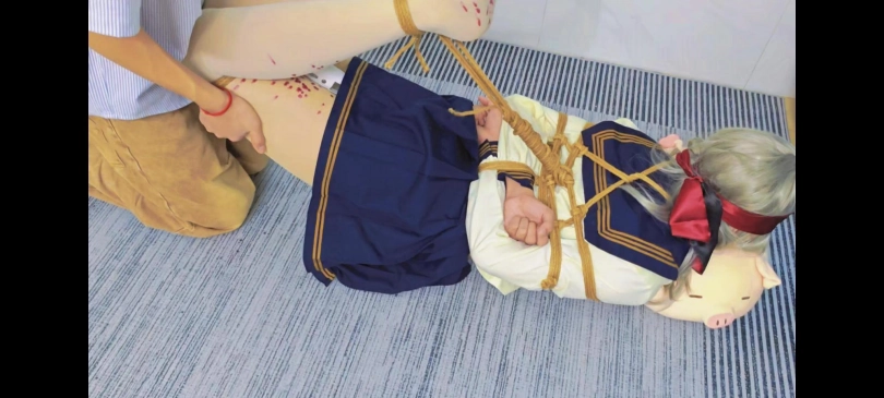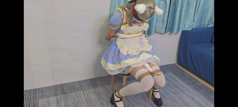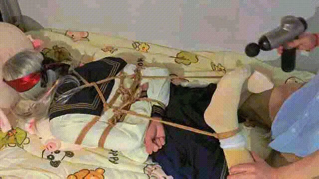 由于我心善,见不得这场面,出于人道主义,忍痛给m休息了两分钟,便又把M抱到了地上,再次绑了起来,还是驷马,绑上之后,也少不了[X_X]抵住刺激,当然头部三件套还是逃避不的。