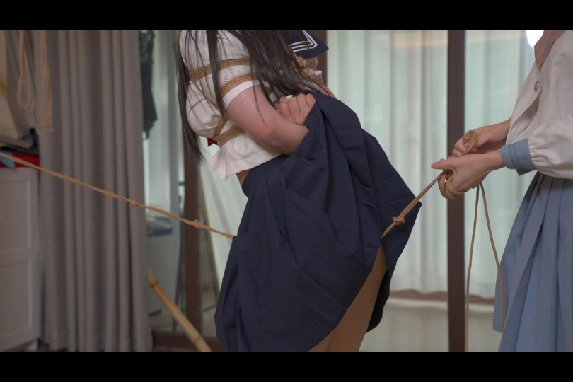 被松开后的嗷嗷不死心,提议再来一次,这次她发现了沉沉的弱点,怕痒,考此捷径偷袭了她,最后讲她制服。这次情况反转,嗷嗷先是在沉沉兄上狠狠过了把手瘾,随后让她走绳,故意不断拉扯刺激沉沉,接着将她盘腿缚捆好,塞入[X_X],暧昧的玩弄调教着沉沉