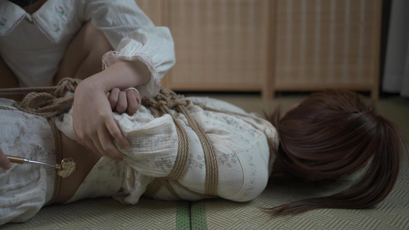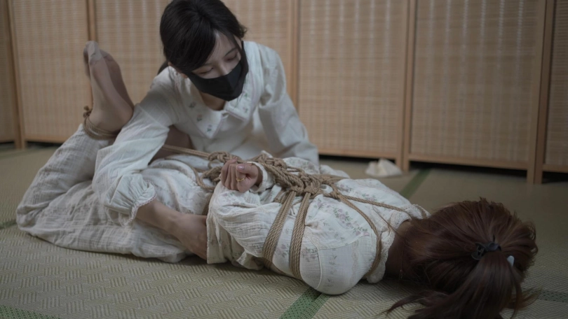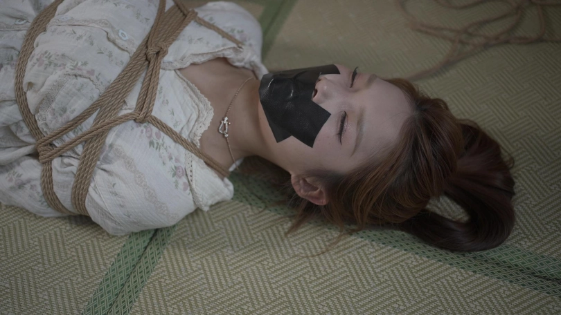 小o觉得机会来了,她努力挣脱了捆绑,趁着雨溪熟睡上去用绳子勒晕了她,接着把她驷马捆绑胶带封嘴。
