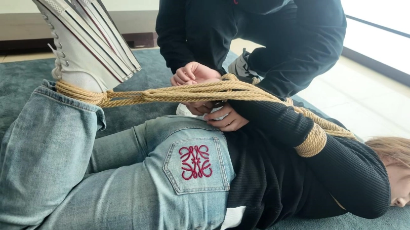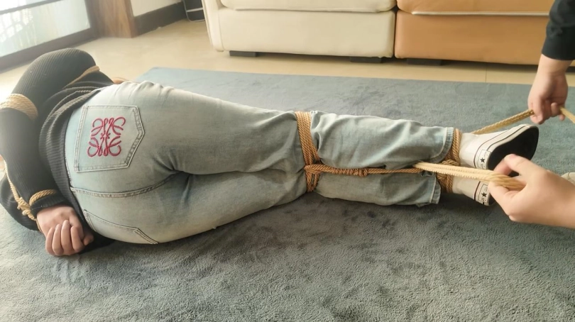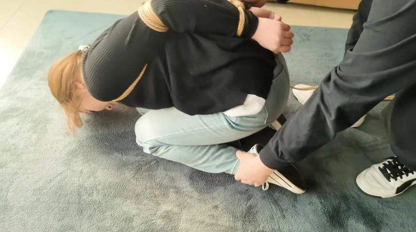 某天下班回家,女孩全然没有注意到身后跟着一个戴着口罩的劫匪,开门的瞬间劫匪冲上前捂住了嘴巴,抓住捂嘴的手激烈反抗却被劫匪警告,接着劫匪押着女孩走进了房间,推到在沙发上,接着拿出了绳子,女孩看到后说:你要干什么,你绑我干什么接着开始激烈挣扎起来,却没办法逃脱被绑匪捆了起来。捆好后劫匪说:钱在哪,拿出来吧。女孩说:没有钱了,都花完了。劫匪生气推了女孩一下不说实话是吧,老实待着吧。接着便自己去翻找柜子.女孩看劫匪在翻找柜子,没有注意到她便想偷偷逃走,可是没想到刚刚站起来便被劫匪看到了,看到他她想逃跑劫匪又拿了跟绳子捆住了腿脚绑成了驷马。女孩见状惊慌的说你要干什么,绑好后劫匪想继续去翻找财物,女孩被放置到原地