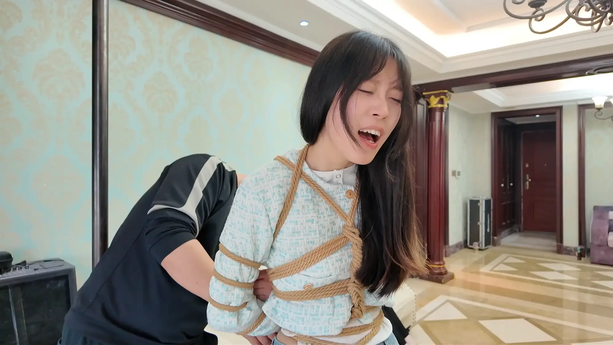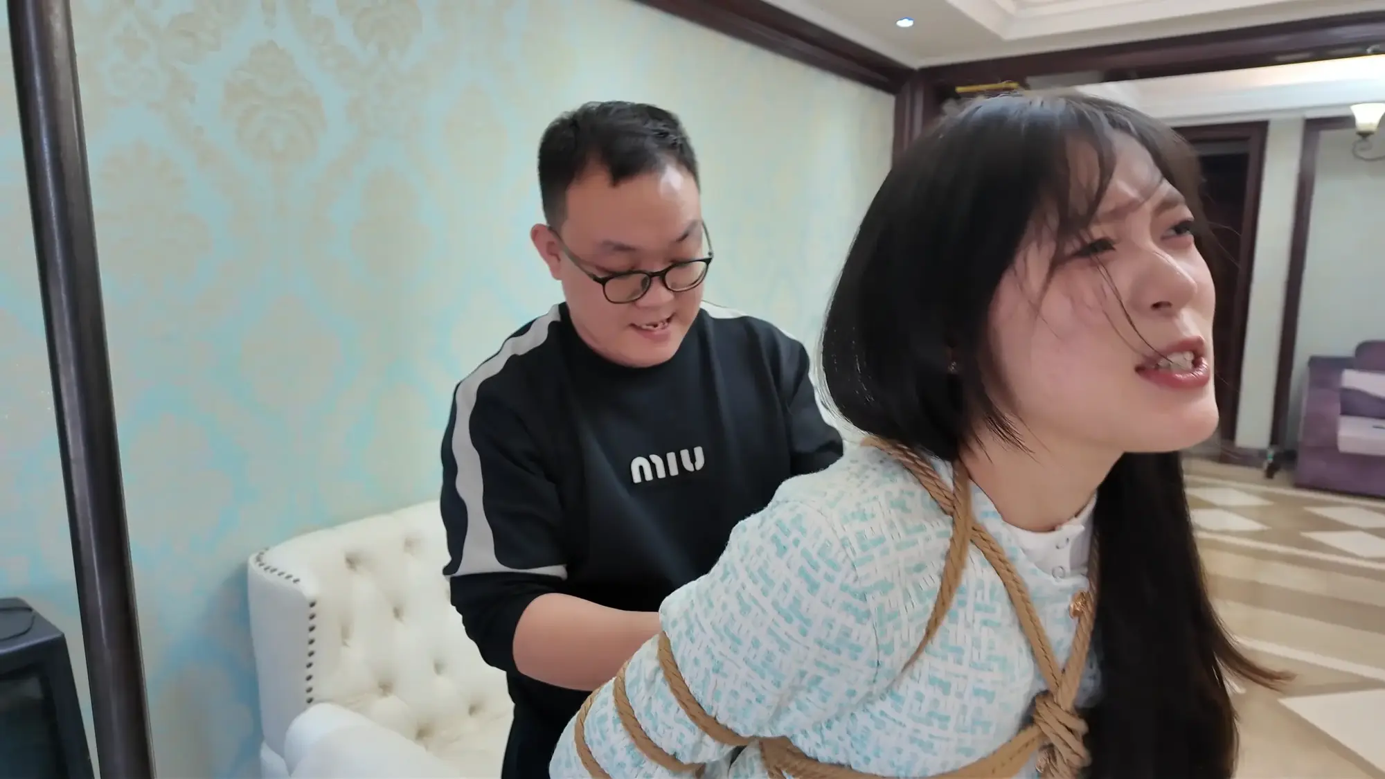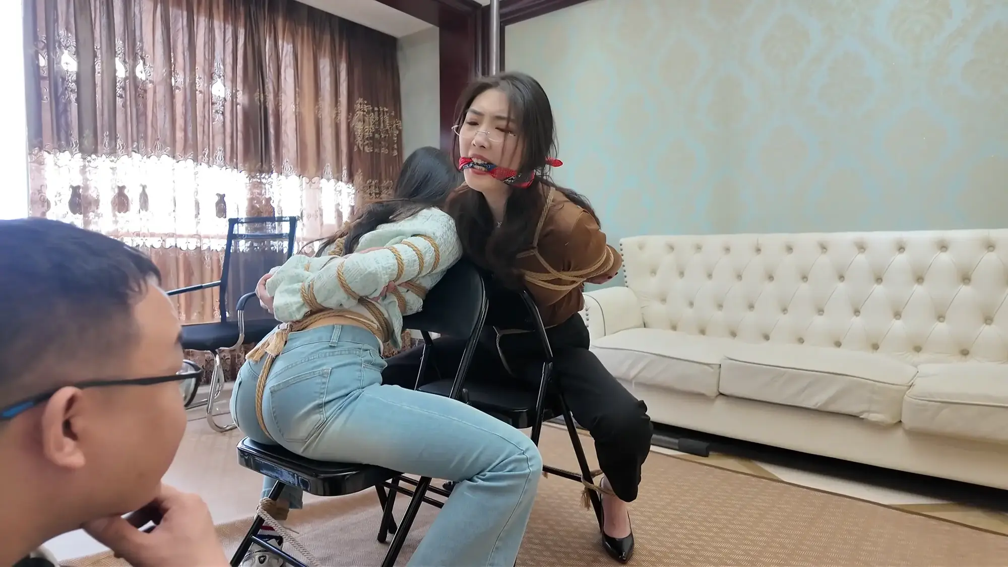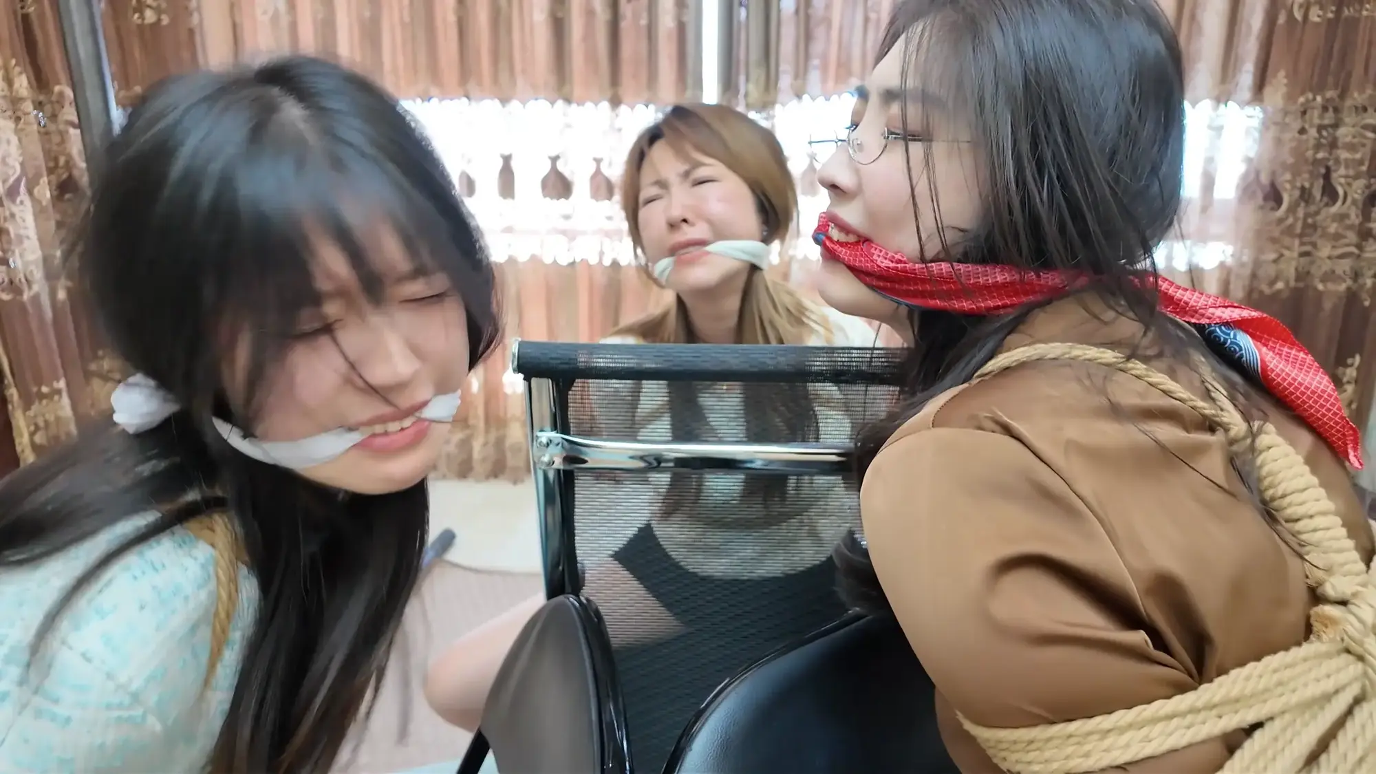 与此同时,米粒挣脱了束缚刚刚准备逃跑,房东正好进入卧室,他立马冲上去将米粒按倒在床上,表示要把米粒绑的更紧一些。画面一转,米粒被反扭着双手带到了大厅,小智与老师眼睁睁的看着米粒被房东紧缚,最终米粒被后高手捆绑放置在椅子上,三人面面相觑,房东见老师不停点头,便将她嘴上的丝巾拿掉,老师嘲讽房东一个大男人欺负她们三个弱女子,并表示自己绝对不会屈服,气急败坏的房东给了老师一巴掌再次用丝巾将她的嘴堵上。随后房东便开始挠三人的脚心。