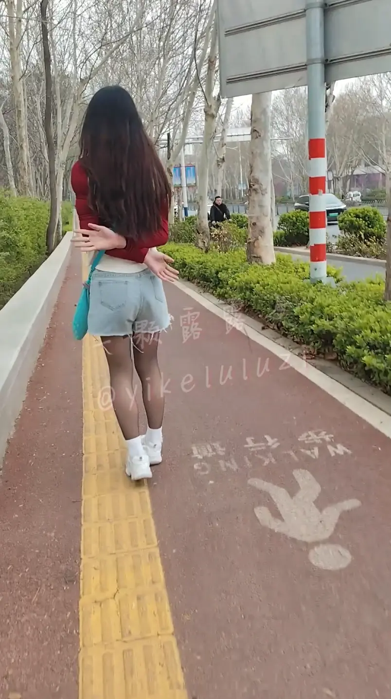 熟悉的衣服不熟悉的环境,热裤黑丝白棉袜,如果多仔细观察能看到背在后面不知所措的双手。日式捆绑全程不披衣服公园和小区和人行道散步,引多人注目观看。