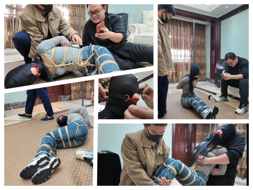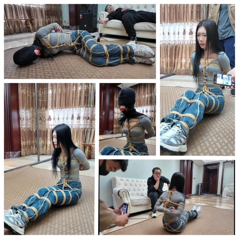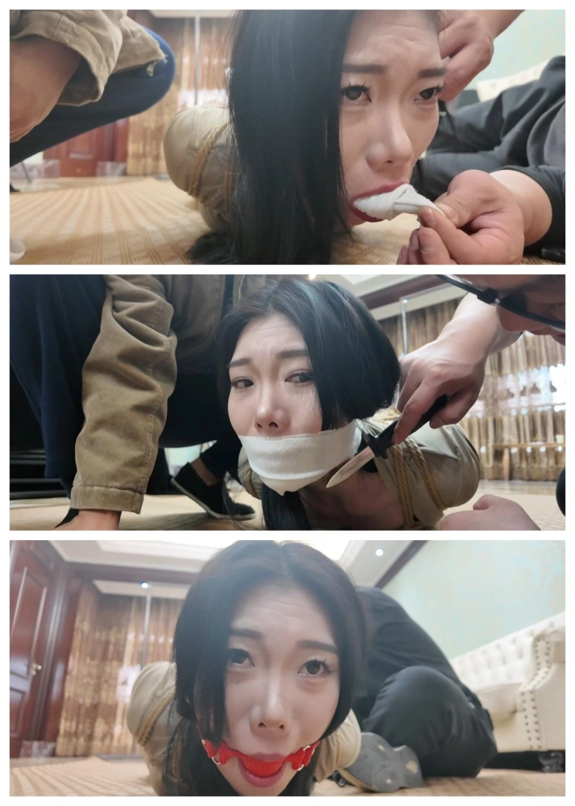 剧接上回,芷溪身着瑜伽服,瑜伽裤,白棉袜被直臂紧缚驷马倒攒蹄捆绑在房间中,嘴巴被严密封堵使她无法呼喊,驷马倒攒蹄使她只能扭动着身体朝门外逃跑,可这难于登天。门外的小偷取到了钱又叫来了一个绑匪同伙,想着从芷溪身上再捞一笔钱,二坏人进门,就看到挣扎的芷溪,于是将芷溪抬到了客厅,为了惩罚她的不老实对她进行拳打脚踢,威逼利诱,拍照侮辱。对芷溪一番折腾后,用到逼问出芷溪钱财的位置,并得知芷溪还有个有钱的姐姐,问到信息后,二人仍没有对芷溪怜香惜玉的意思,等待芷溪的是一个口球紧紧塞入芷溪的嘴里,接着再脑后紧紧扣住,芷溪吃疼却只能发出呜呜呜的声音。接着二人将芷溪挣扎录成视频,将视频发给芷溪姐姐,以此威胁芷溪姐姐(大雷)要赎金来救芷溪。可穷凶极恶的绑匪哪会只想拿赎金那么简单呢?二人商量一不做二不休,趁着交换赎金的机会,把大雷一起绑架了。一拍即合,二人给肉货芷溪换了套衣服,接着重新五花大绑手脚,然后为方便行动,二人将耳塞塞入芷溪耳朵里,然后用黑色胶带缠绕封住她的眼睛,再用白布蒙眼,这下芷溪就是听不见也看不见了,虽然二人一人摁住芷溪的头,一人用黑色头套把芷溪的头牢牢套上,把芷溪严严实实的进行了感官封闭,为了防止芷溪叫喊,二人又用红色口球堵塞了芷溪的口部,刚芷溪看不见,听不见,叫不了,动不了,成了一件人人随意摆布的肉货!二人将肉货(芷溪)抬上了MPV的后座,在车上也不能让芷溪放松一下,坏人脱了她的一只鞋子,用力挠她的脚心,听着芷溪被挠脚心而发出的呜呜呜呜呜声音好不享受。一会,到达交易地点,二人把芷溪关在后备箱,然后下车等候来交赎金的大雷,大雷来到了后提出了要先验货,于是二人打开后备箱,大雷看着车上五花大绑,黑头[X_X]头,红色口球堵嘴的少女,提出疑问:戴个黑头套,我怎么知道是不是我妹妹?绑匪说到:你自己上去把头套取下来就知道了。大雷上车取下了芷溪的黑头套,看到了就是自己的妹妹芷溪说了句:妹妹你受苦了。可一会,绑匪也上了后备箱并关上后备箱门,这下,大雷也一起受苦了。后备箱里,绑匪用到威逼大雷,让她不敢动弹,然后又用麻绳将她捆绑起来,捆绑结实后,用一只白色棉袜塞入大雷嘴里,然后用五张布基胶带将大雷嘴巴封上,这下大雷也是手脚不能动,嘴不能喊叫了。被控制并捆绑堵嘴后的二女成了两名猥琐绑匪的玩物,二绑匪玩弄二美女,挠脚心,挠腰,挠胸全都安排上了。二女也只能呜呜呜挣扎,玩累的二绑匪决定将二女运回关肉货的地方,于是发动车辆,出发。发车后,二女在后备箱挣扎并呜呜呜但也无济于事,只能等待命运的安排!