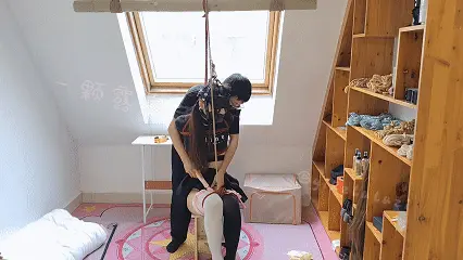 一颗露露子原创系列,露脐装蛋糕裙黑白鸳鸯过膝袜的露露突然接到一个不(那么好的点子……),要求被直臂绑在吊杆上,强制用分腿器把脚踝分开,不但如此,膝盖也要被绑在一起强制类似蹲马步的姿态。