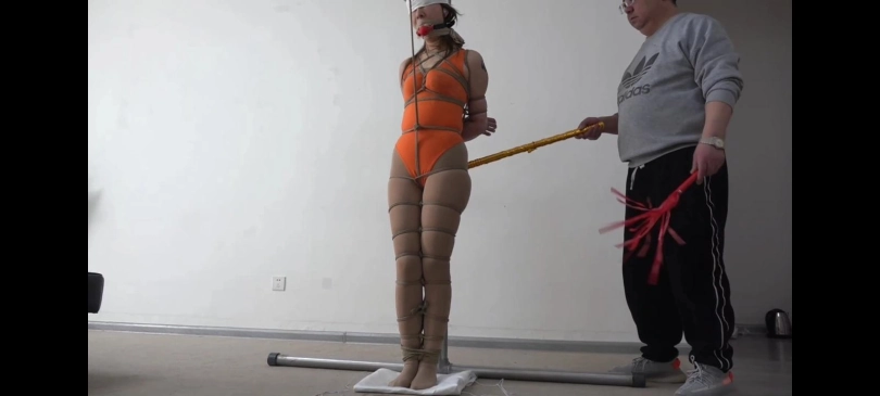 女侠被困在刑架上,股绳链接水桶,[X_X]嘞的很爽坏蛋想把女侠永恒囚禁在,脚底放了电击贴片女侠脚碰到就会放电,只能踮起脚然后耳朵堵上棉花,眼睛被胶带缠住,用丝袜包头,然后一直挠痒鞭打折磨,最后把她用定身器定住电击折磨。