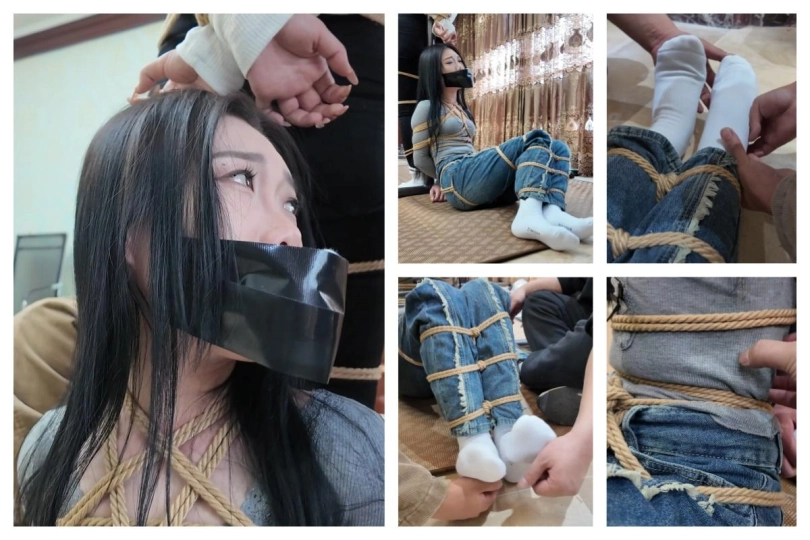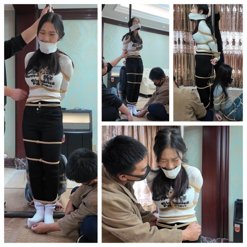 言归正传,剧情如下:绑匪一脚刹车,连坐在位置上的坏人都朝前一下,头撞到了驾驶座位,痛苦不已,当然更痛苦的是塞在后备箱的两美女,呜呜表示抗议,可两绑匪哪管美女的抗议,哪懂什么怜香惜玉呀!下车,打开后备箱,抗两美女一气呵成,简直不要太熟练。镜头一转,两绑匪扛着两美女走进了他们的老巢,将两美女扔到沙发上,然后两绑匪将两美女搂在怀里,开始讨论如何玩弄她俩,芷溪和大雷呜呜呜又屈辱又不情愿又无可奈何,被五花大绑的自己只能接受命运的安排,成为绑匪的玩物!两绑匪一番商量决定把大雷站着捆绑在柱子上,把芷溪坐着捆绑在柱子上,这样有两个好处,就是方便两绑匪玩弄两美女,而两美女除啦能扭动身子其他动弹不得。商量决定后,二绑匪先将大雷捆绑到柱子上,捆绑好她上身后,二绑匪脱去大雷的靴子,露出了白袜,然后再将她的双脚捆绑到柱子上;将大雷捆绑结实后,绑匪又将芷溪压到柱子边,让芷溪坐下后也将她结结实实地捆绑在柱子上。将两美女捆绑结束后,绑匪拿来一块厚毛巾,解开芷溪的口球后,将厚毛巾塞入她的樱桃小嘴里,也是难为芷溪了,樱桃小嘴里塞着块厚毛巾别提多难受了,可绑匪丝毫没有停下,继续在芷溪嘴上贴了五张黑胶布,彻底让她说不了话了,只能发出呜呜呜的闷哼;将芷溪捆紧堵严后,二绑匪将手伸向了大雷!对于大雷的嘴巴,当然是绷带伺候,一圈又一圈缠绕的白色绷带把大雷嘴里的棉袜深深地堵在嘴里,让大雷就算在难受也只能发出几声呜呜呜的闷哼。将二美女捆紧堵严后,两绑匪兴奋到了极致,立马合力脱了芷溪的鞋子,对着她的白袜脚,腰子疯狂TK,芷溪呜呜呜得难受挣扎,绑匪问芷溪:舒服不舒服?芷溪摇摇头呜呜呜不舒服,绑匪说到:那就继续挠,挠到舒服!芷溪又受着TK,接着绑匪又问到:舒服不舒服这回?芷溪呜呜呜道:舒服了!绑匪说到:舒服呀?舒服就再让你舒服一下!这绑匪是真的损,挠着芷溪后又问她,这回你舒服了,是不是让你姐姐也挠一挠舒服一下?芷溪呜呜呜摇头拒绝,绑匪说到:那既然你姐妹情深,就继续挠你。芷溪呜呜呜带着哭腔再次接受新一轮的挠脚心,挠腰子呜呜呜!接着,绑匪又问到:这回你爽了吧?该挠你姐姐了吧?芷溪呜呜呜含糊不清道:挠姐姐吧,我受不了了。绑匪说到:是你连累你姐姐,现在还让我们挠你姐姐,我们要教教你怎么做人!接着加大挠的力度,芷溪呜呜呜被TK得筋疲力尽只得低着头,生无可恋的发出呜呜呜的声音,玩腻了芷溪的二绑匪,又将坏念头指向大雷,又开始对大雷动手动脚还说:事情都因为你妹妹而起,要怪就怪你妹妹吧,和我们没关系。然后对着大雷的腰子,脚心疯狂TK,大雷呜呜呜挣扎,可胸部,肩膀,双手,大腿,膝盖,脚腕都被结结实实绑在柱子上的她,除了发出呜呜呜的声音外做不出任何回应。接着二绑匪觉得二人玩一女腻了,就分工,一人挠一女,好让芷溪和大雷都享受到被TK的快乐!最后玩腻的二人,决定去吃点东西,检查完二美女身上的绳索捆绑得是否紧缚和嘴里的堵塞物是否严实后,对美女进行警告,让二美女老实点后离开,留下被结实捆绑堵嘴的二女在柱子上挣扎并发出呜呜呜的声音。