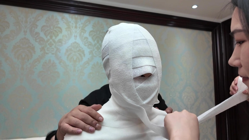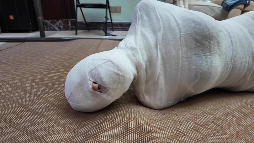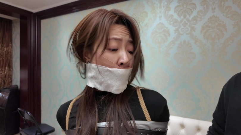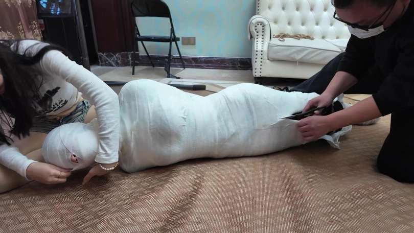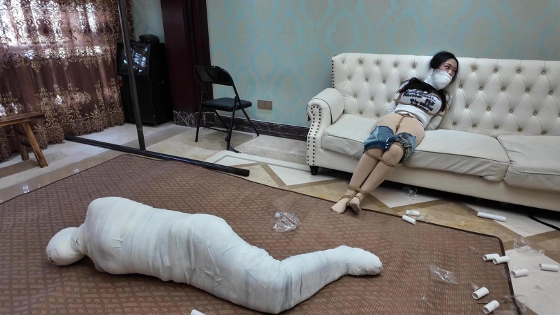 男女劫匪离开后,女保镖和佳雯继续在沙发上挣扎呻吟,由于她们两人的手掌也被包裹起来,根本做不了什么。过了一会儿,佳雯成功用脚替女保镖弄脱了两个厚重的口罩,女保镖的呜呜声也变回大声了一点,不但如此,女保镖的手机从袋中掉在地上,两人不断尝试用脚趾拨弄手机号码。由于两人的丝袜脚太过顺滑,她们花了很多久仍未能成功拨打号码。此时男女劫匪突然想起回到家中拿回工具,正好看到她们两人不老实用脚趾拨弄电话,于是过去把电话没收了之如,决定对她们两人施加额外惩罚。男女劫匪先互相蹂躏女保镳和佳雯有人的身躯,两位美女在多重的捆绑之下只能任由男女劫匪鱼肉。此时,女劫匪想起一个点子,为了带走更少的捆绑道具,她突然想起一个乐趣味的点子,就是把所有绷带用在女保镳的身上,把她包成木乃伊,女劫匪想试试把女保镳包成木乃伊后,她还有没有能耐挣扎逃脱。男女劫匪开始互相配合,不断用绷带往女保镳的身上缠绕,直到从头至到脚趾,没有留下一点空隙,而在沙发上挣扎的佳雯只能白白看着自己的女保镳变成一具完美的木乃伊在地上挣扎。男女劫匪临离开前也不忘玩弄佳雯的股绳,直到她忍不住[X_X]。男女劫匪之后离开家中,任由那两女在屋内挣扎。佳雯的爸爸晚上回到家中,看见自己的女儿和女保镳被拘束着,最终救下了她们。