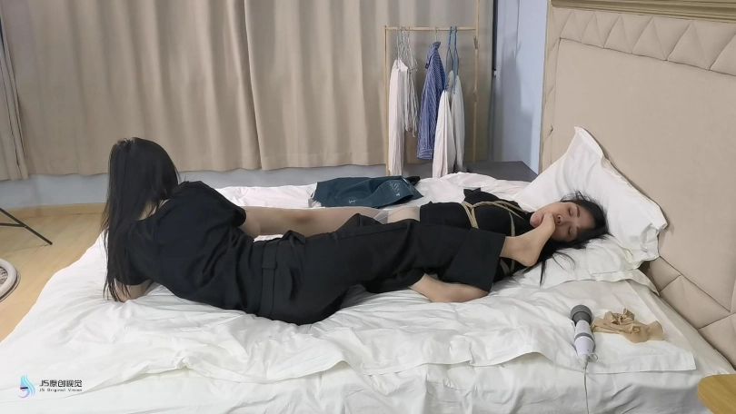 哈妮用丝足不断摩擦少妇的裆部,挑逗着她。然后抚摸亲吻着少妇的丝足,同时将自己的丝足[X_X]少妇的嘴里。哈妮骑在少妇的身上,拿出棒棒放在她们的裆部中间,在棒棒的强力震动下,两人很快就双双共同达到GC。玩够的哈妮准备将少妇运走。将少妇驷马捆绑起来,堵嘴,蒙眼。拿出一个TD放进少妇的裆部,这么做能保证在运输的途中,在TD的刺激下她无力法抗,也能一点点消耗她的体能。接到哈妮电话的同伙来到现场,并将少妇抗走。。。