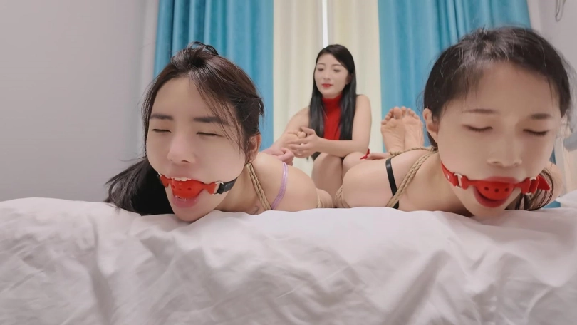 两姐妹被佳佳绑在柱子上,佳佳给姐妹俩头上套上丝袜,胶带缠住眼睛和嘴巴,佳佳取回了钱之后没有放了两姐妹,二十将二人押走,开始新一轮玩弄。