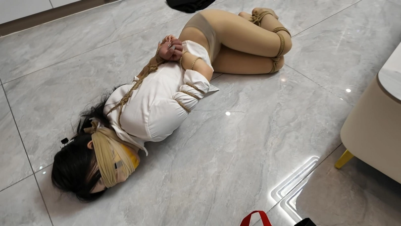 白领十一下班回家,没想到家里已经藏了一名歹徒,用刀威胁十一自己用胶带把嘴巴封起来,然后用绳子把手紧紧的捆绑起来,十一费尽力气挣扎想逃跑,被歹徒发现后捂晕,用多条丝袜封眼,蒙嘴