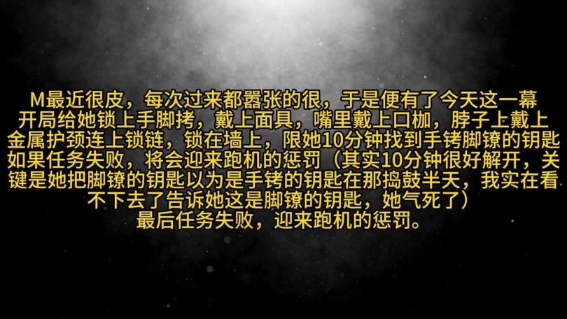 开局给她锁上手脚拷,戴上面具,嘴里戴上口枷,脖子上戴上金属护颈连上锁链,锁在墙上,限她10分钟找到手铐脚镣的钥匙如果任务失败,将会迎来跑机的惩罚(其实10分钟很好解开,关键是她把脚镣的钥匙以为是手铐的钥匙在那捣鼓半天,我实在看不下去了告诉她这是脚镣的钥匙,她气死了)