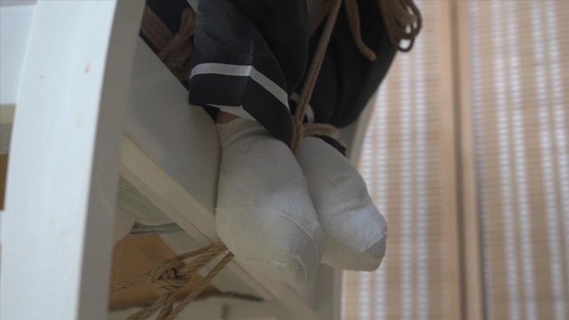 鞋子脱掉绑在椅子上,双脚被向椅子后拉伸离开地面