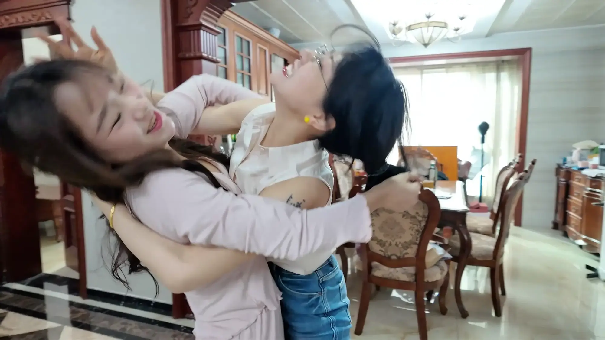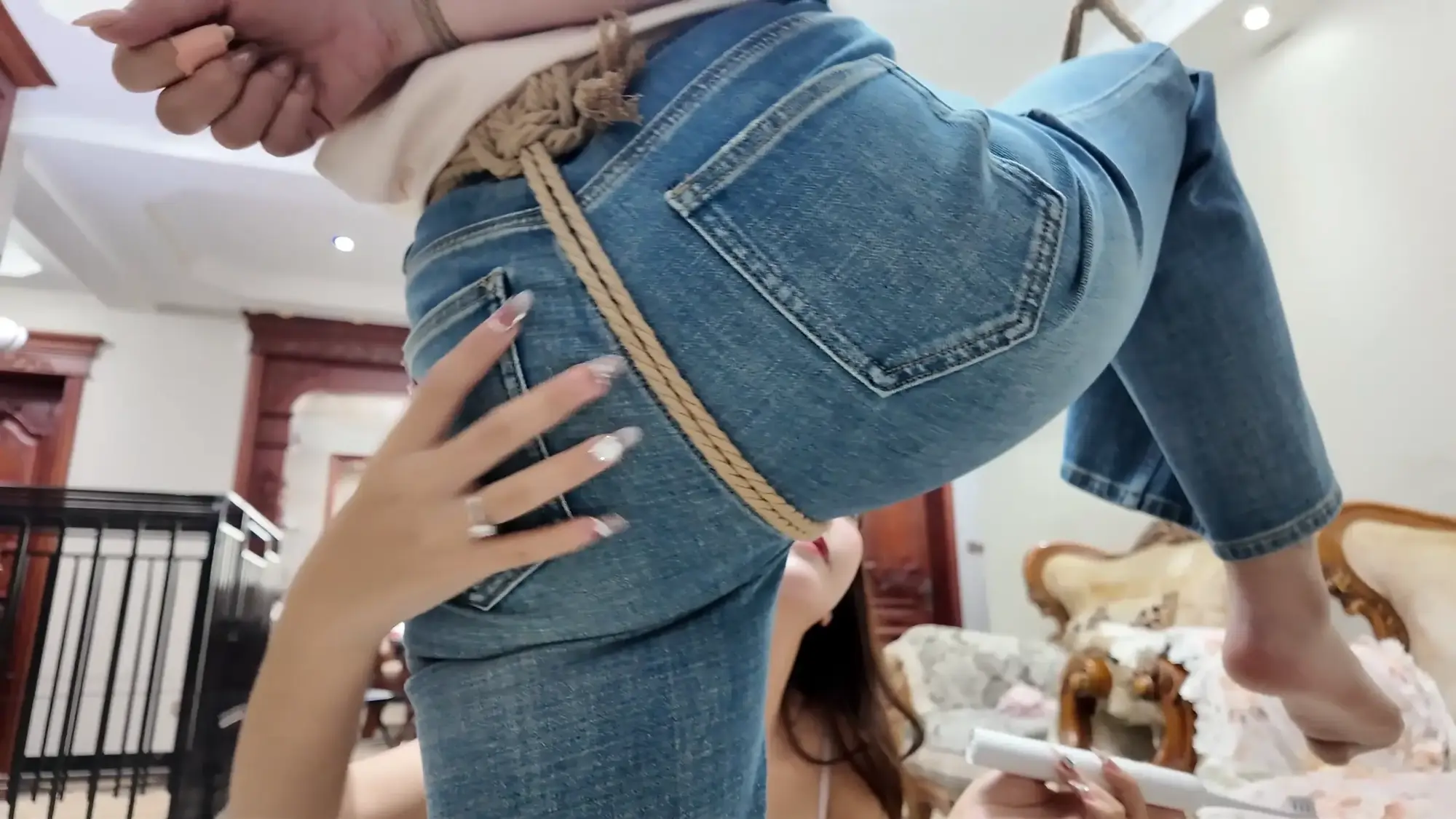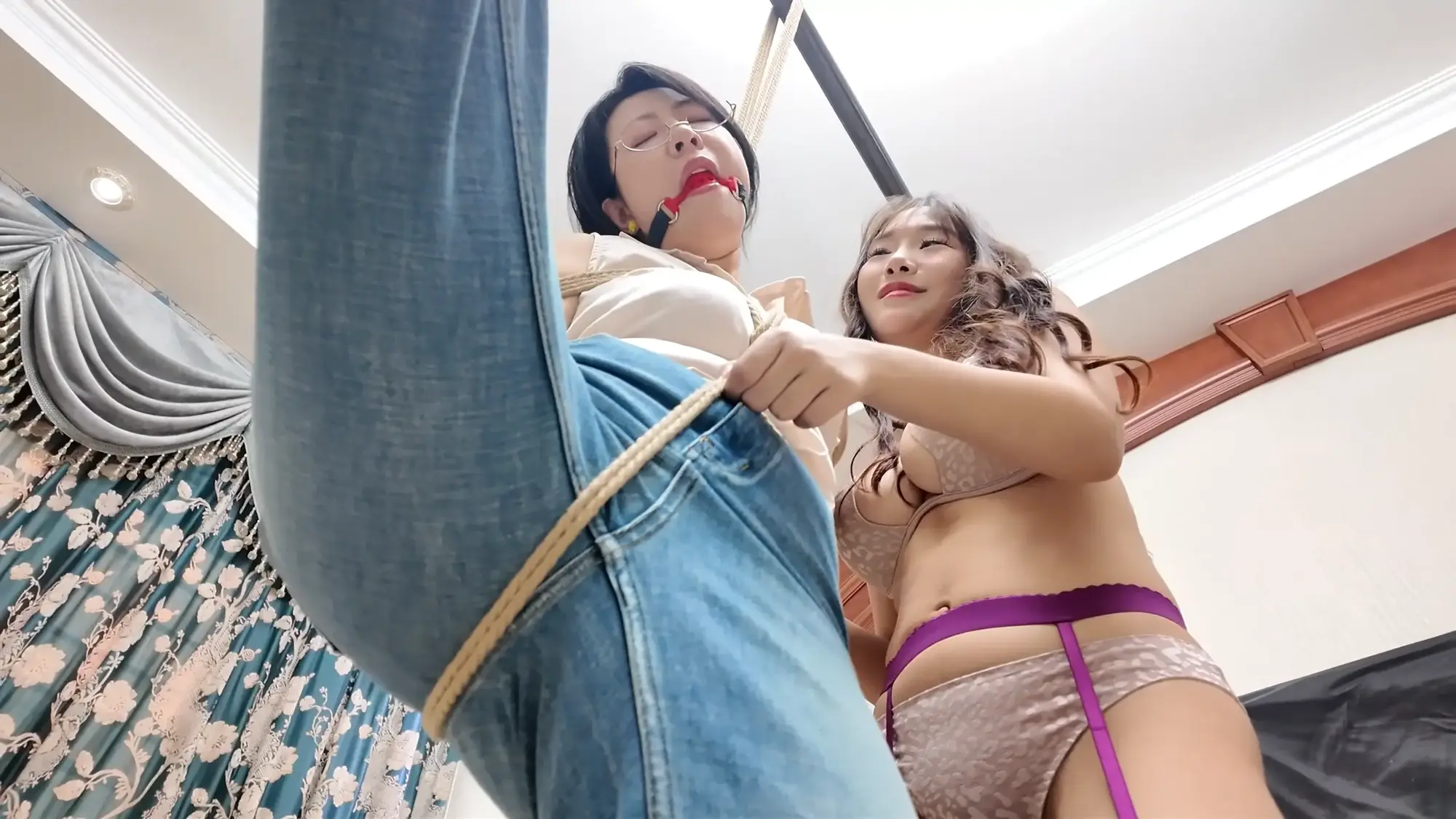 出轨的渣男丈夫沉沦美色,每日在自己的家中与老婆的闺蜜小米缠绵,半个多月过去,小米发消息告诉丈夫自己还有一周回来,丈夫为了保险起见,让小雯不要继续住在家中,谁知小雯竟为此吃醋发小脾气,作为小三渣男丈夫自然也是懒得应付,随便找了个理由便出门了,并告知小雯尽快收拾东西离开,发现闺蜜丈夫只是看上自己美色的小雯气急败坏,偶然看到闺蜜小米的睡衣,便穿在身上在镜子前端详自己。这时小米已经来到家门口,原来她为了给丈夫一个惊喜所以骗他自己还有一周才会回家,进了家门后小米呼喊丈夫,被浴室中的小雯听到,小雯不仅没有慌张反而是对着自己的手机坏笑了起来,她走出门叫住了小米,小米质问小雯为什么穿着自己的睡衣,小雯一阵嘲讽后亮出了手机中偷情的照片,小米一气之下与小雯扭打起来,最终小米不敌小雯被掐晕,醒来后自己已经被小雯单腿吊缚。
