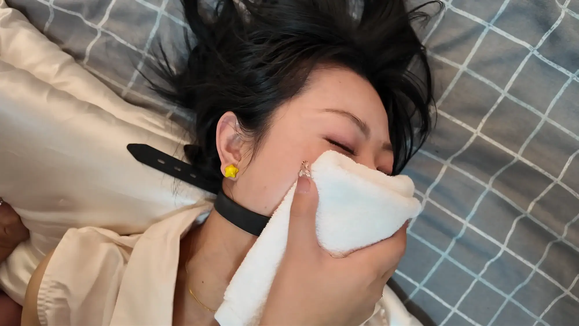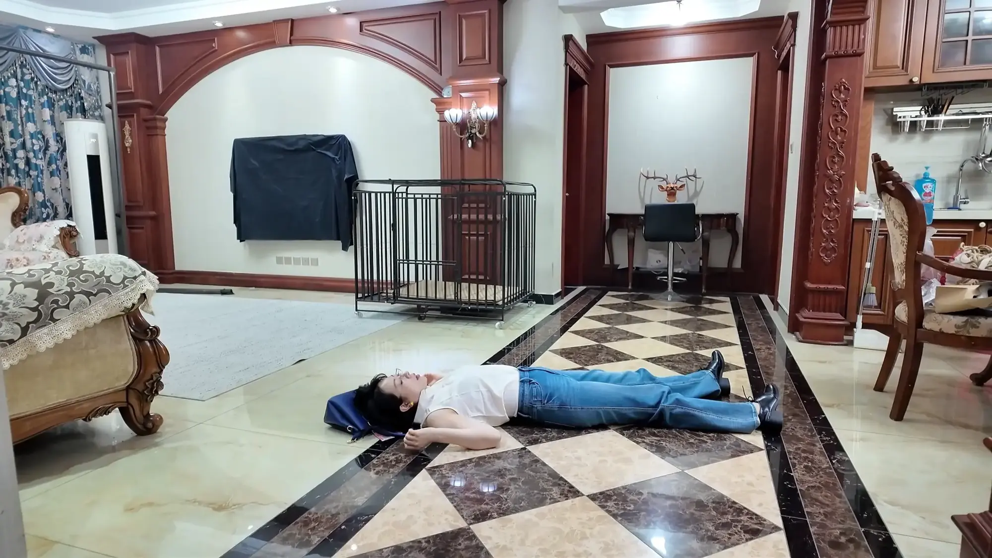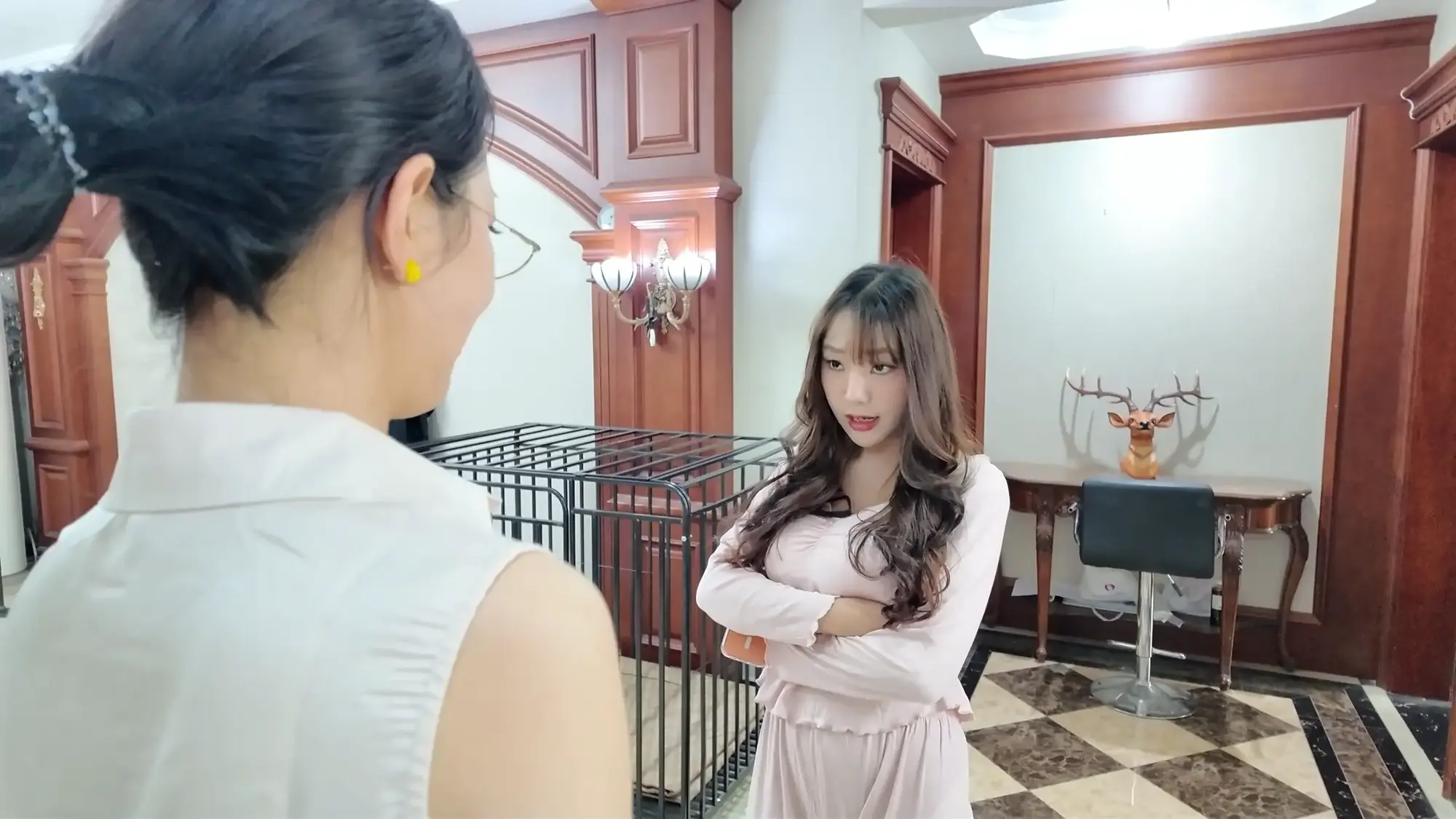 出轨的渣男丈夫沉沦美色,每日在自己的家中与老婆的闺蜜小米缠绵,半个多月过去,小米发消息告诉丈夫自己还有一周回来,丈夫为了保险起见,让小雯不要继续住在家中,谁知小雯竟为此吃醋发小脾气,作为小三渣男丈夫自然也是懒得应付,随便找了个理由便出门了,并告知小雯尽快收拾东西离开,发现闺蜜丈夫只是看上自己美色的小雯气急败坏,偶然看到闺蜜小米的睡衣,便穿在身上在镜子前端详自己。这时小米已经来到家门口,原来她为了给丈夫一个惊喜所以骗他自己还有一周才会回家,进了家门后小米呼喊丈夫,被浴室中的小雯听到,小雯不仅没有慌张反而是对着自己的手机坏笑了起来,她走出门叫住了小米,小米质问小雯为什么穿着自己的睡衣,小雯一阵嘲讽后亮出了手机中偷情的照片,小米一气之下与小雯扭打起来,最终小米不敌小雯被掐晕,醒来后自己已经被小雯单腿吊缚。