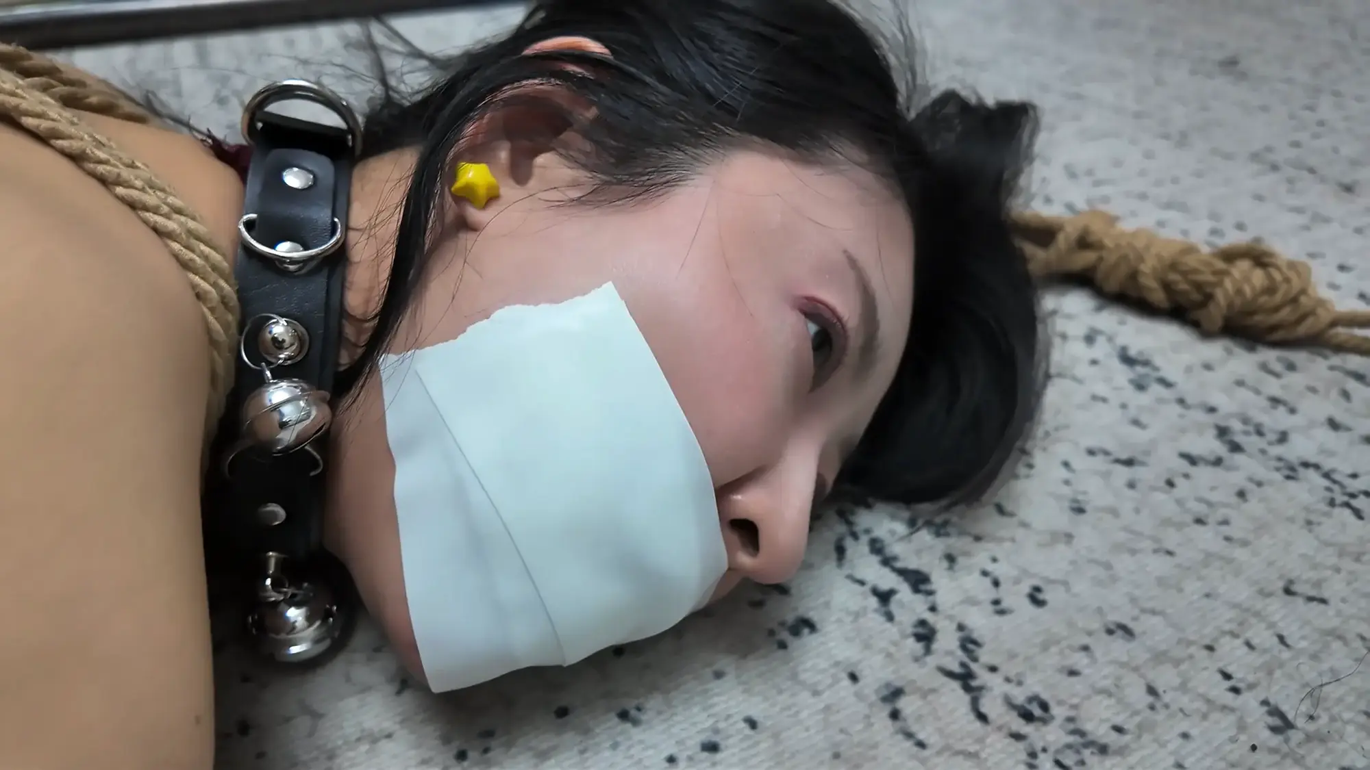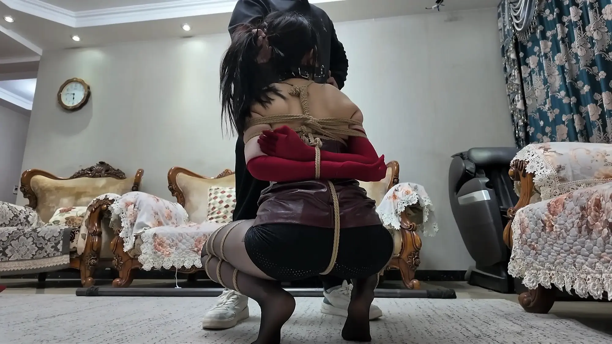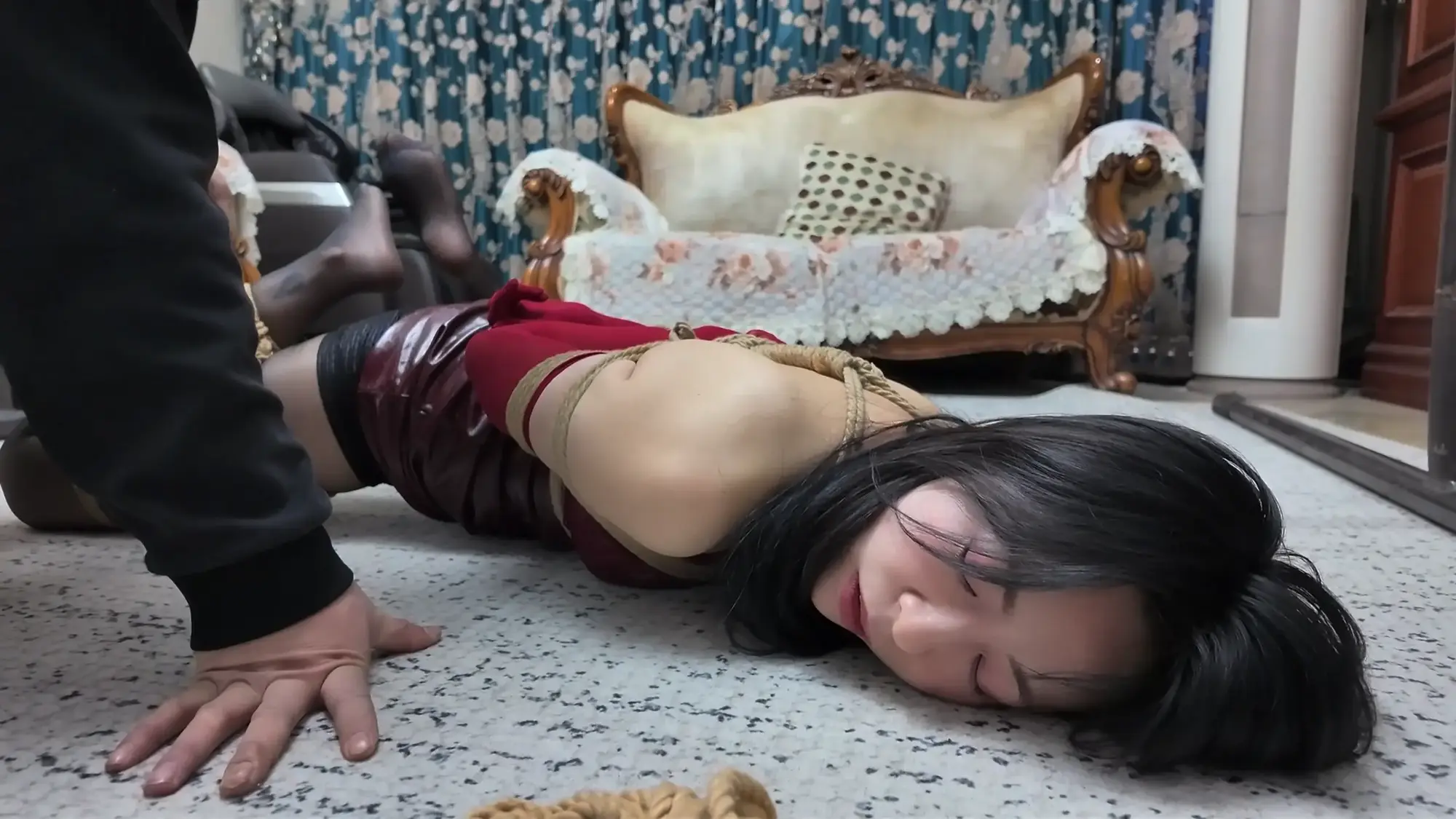 莫璃被绑成了M腿,屁股翘着趴在地上,羞耻的姿势让她难堪不已,