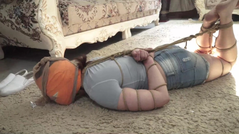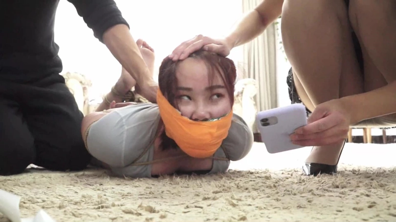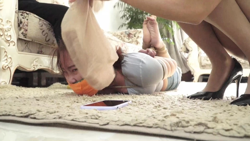 痛苦的梁静在紧缚与塞嘴折磨下扭动身体在地上挣扎着,还要被迫忍受套头夏炎臭丝袜的味道呜呜闷哼呻吟着,挣扎几下后,精疲力尽的梁静慢慢减小了挣扎幅度,低下头在黑暗中喘息着。