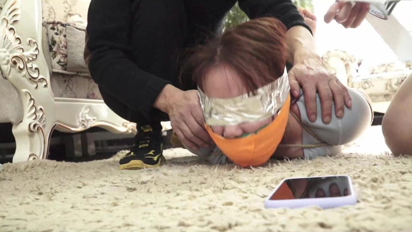 (夏炎与锁哥把想逃跑求救的梁静抓回来,捆成驷马放置在沙发前地上)