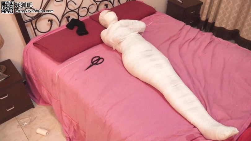 最后,他们合力把李然放在床上,用余下的绷带连李然的脚掌也包起来。经过了20分钟,李然已变成了一具完全的木乃尹在床上扭动,夏炎不禁在床上抱住木乃伊玩弄一会。劫匪把一把剪刀放在木乃伊身旁,嘲笑可以用来自救后就离开。留下来的李然不停挣扎扭动,在股绳的折磨下只能不断发出闷叫声,在黑暗中等待来救她的人。
