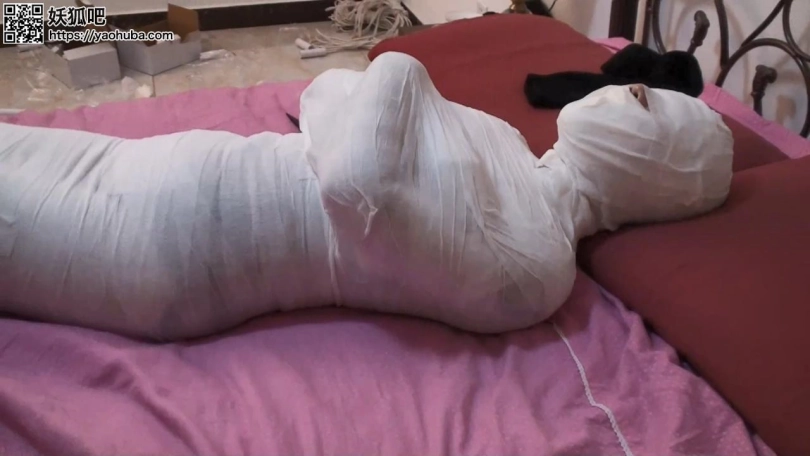 两人合力把李然包了一层后,生怕一层的包里不够,再用绷带把李然的上下身再包多一次。这时李然全身已经被包了两层的绷带完全不能动弹。男劫匪拿走李然口中的裤袜,警告给李然如果再骗他们,不然下一次就卖她给人口贩子。李然向劫匪们表示也没有必要把她包成这么严密,自己不是什么猛兽。夏炎在衣柜拿出子条新的黑色裤袜一下全堵进李然的嘴里,说这是惩罚,不得抗议!
