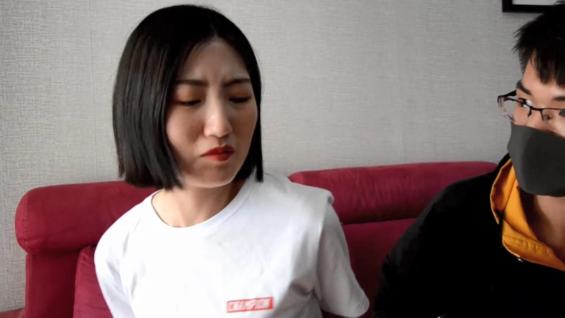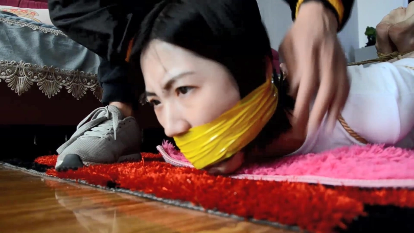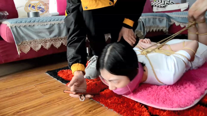 很快,劫匪将小鱼五花大绑,双腿与脚踝并拢捆绑多道,驷马后放置在客厅沙发前地上。