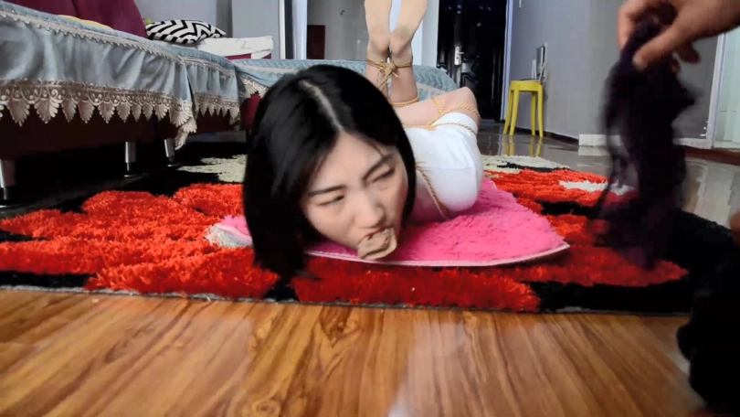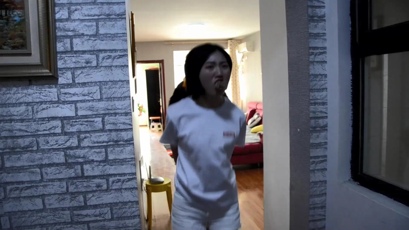 情节:小鱼在家遭遇入室抢劫,劫匪将其双手反绑,脚踝捆绑后给其带上塞口球。