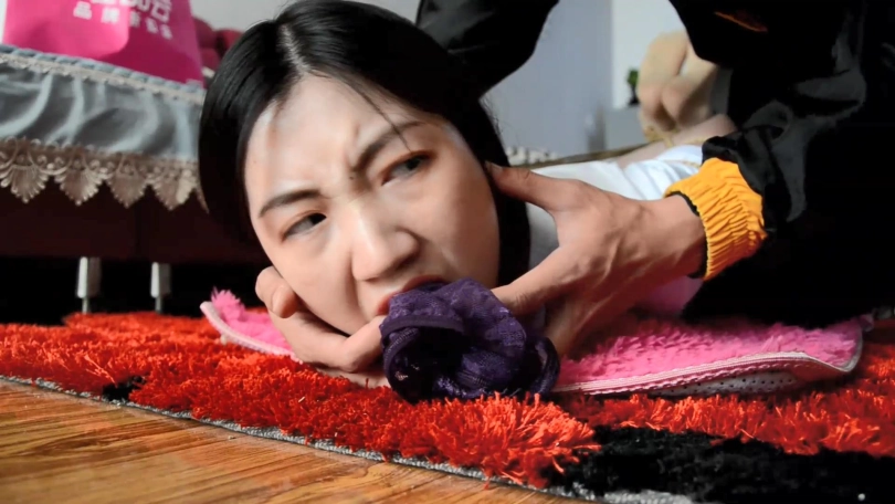 小鱼被脏内裤塞得表情痛苦直翻白眼,劫匪并没有停手,“再给你加点料!”只见他脱掉了小鱼脚上穿的一双肉色短丝袜,把这双肉色短丝袜继续塞进小鱼嘴里,塞得满满的。