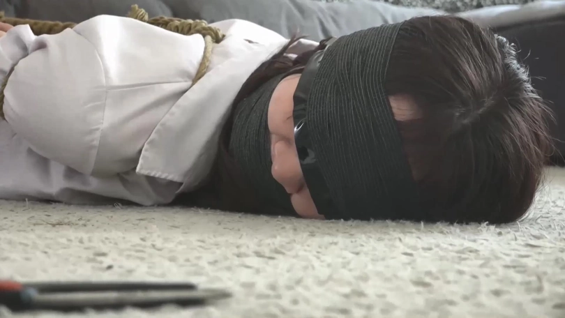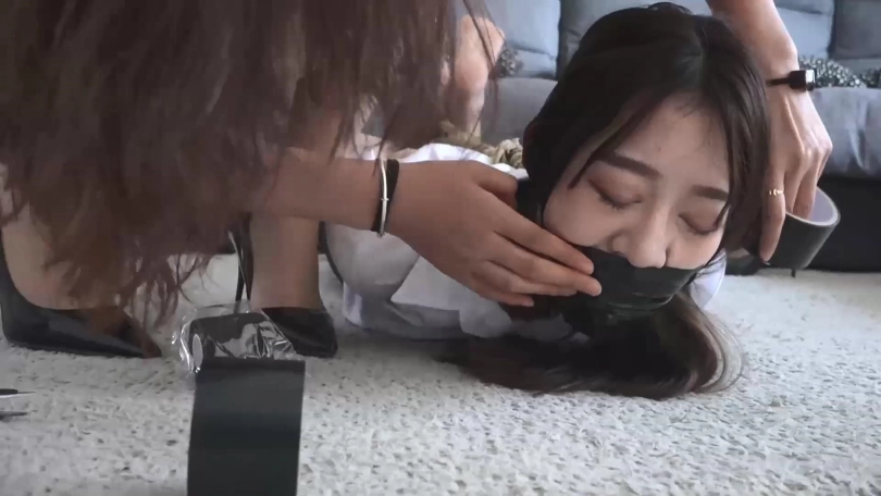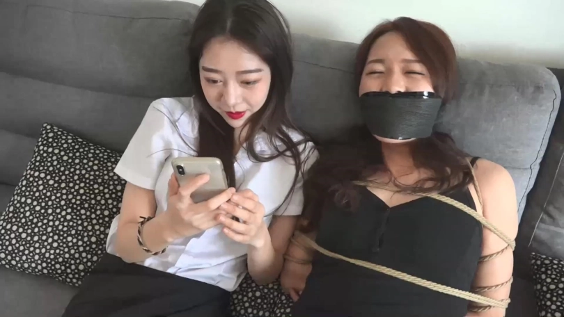 二人手背后拿着束缚工具慢慢走近客厅沙发上坐着的媛媛,很快媛媛就被二人五花大绑,口中被塞口球塞住,发出含糊不清的呜呜声。
