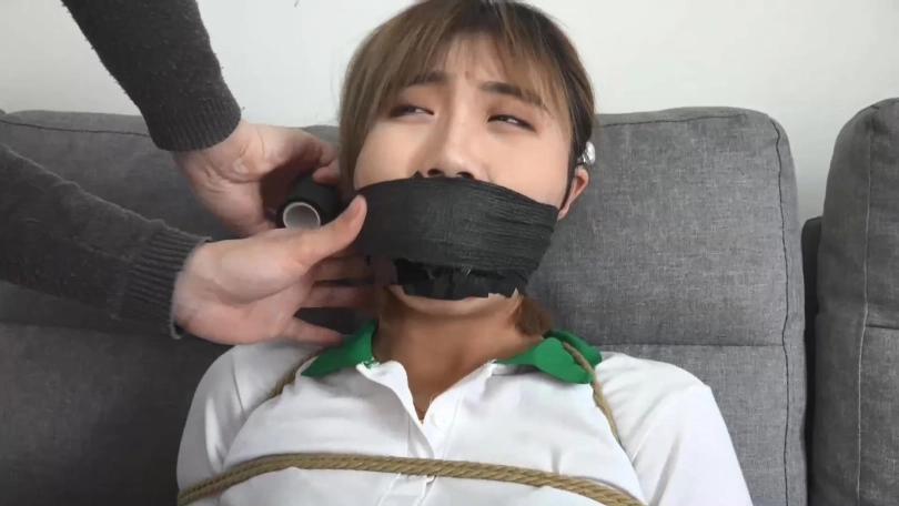 劫匪拿黑色胶布、黑色胶带、黑色自粘绷带缠绕封住阿琳的嘴巴,还把她驷马捆绑放置在沙发前地上,故意给阿琳拍照加以羞辱。