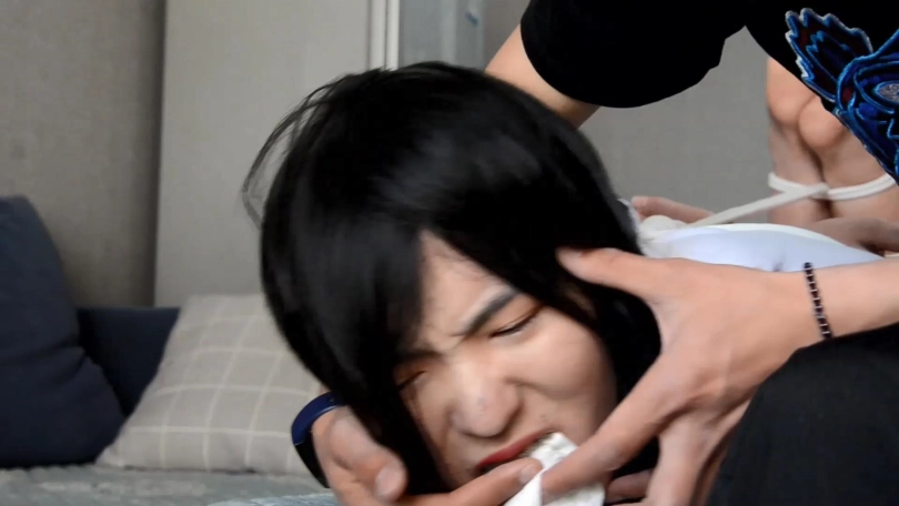 美女小楠回家被劫匪袭击,劫匪拿白色绳索将小楠捆成简易欧式,将一条小楠穿过没洗的原味内裤塞入她的口中,继续翻找财物。