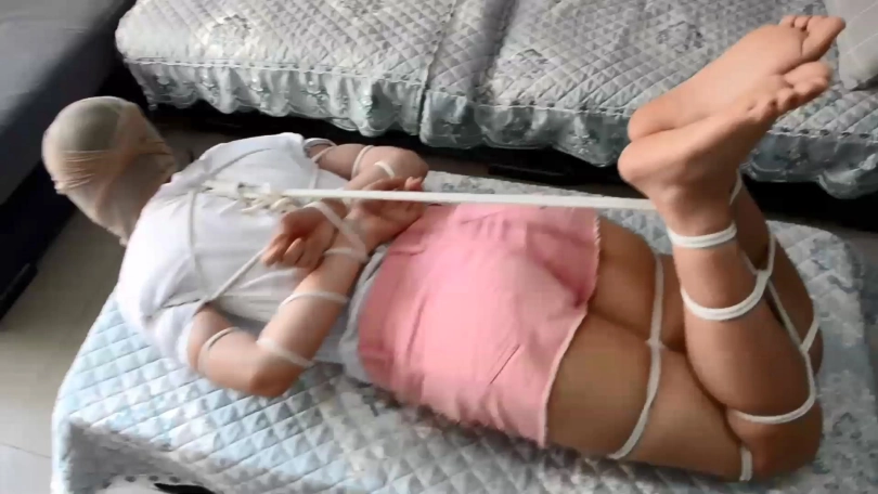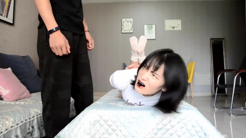 穿着白色锦纶丝袜的小楠坐在床上拼命挣扎,一度挣脱了手腕处的捆绳,试图用手指拽出口中的脏内裤,但被劫匪过来发现。