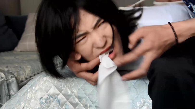 劫匪将小楠五花大绑,捆成驷马,脱掉小楠脚上的白色锦纶丝袜,“挣扎了半天,出了不少汗吧!”拽出小楠口中的内裤,把这双原味白色锦纶丝袜一只只塞入小楠的口中,塞得小楠表情痛苦。
