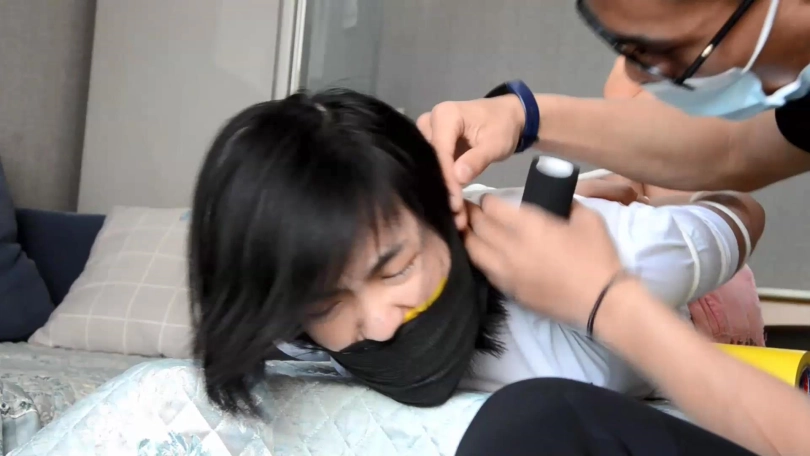 劫匪拿黄色宽胶布封在小楠嘴外,用黑色静电胶带和黑色自粘绷带缠绕封紧小楠的嘴。看着剧烈挣扎的小楠,劫匪又拿小楠穿过没洗的一条肉色连裤丝袜,先拿胶带与绷带封住小楠的眼睛,再把原味连裤丝袜套在小楠的头上,两个袜腿故意在小楠鼻子下面缠绕打结。