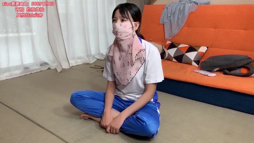 自缚道具:蓝白校服一套,白色黑边水手服棉袜一双 捆脚短绳2根 自缚长绳1根 粉色碎花面纱 眼罩