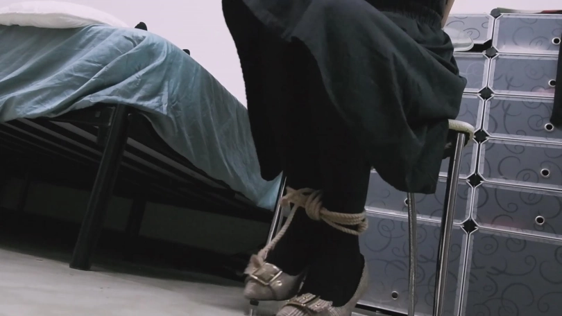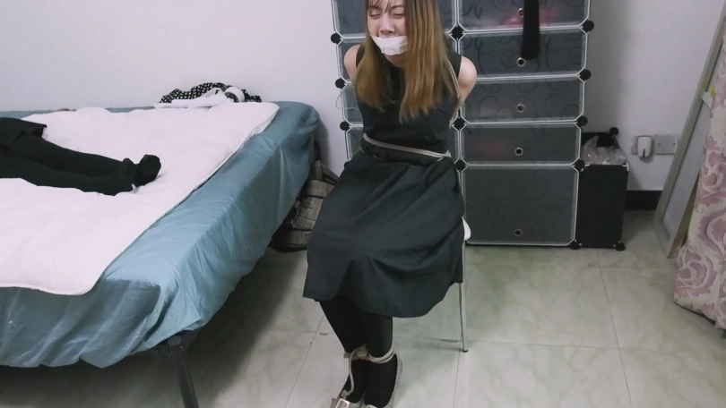 再将张涵从椅子上解下来,将手臂的捆绑加固,把捆绑脚的绳子解开,捆到大腿根,然后拿起那双还没拆开的