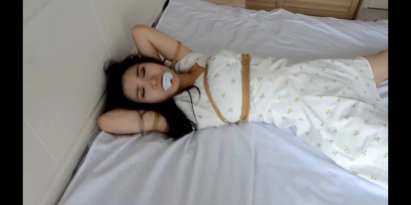 (歹徒已经用绳子五花绑住了二人,二人胸部都被勒住,又加上白色长筒袜蒙住二人的嘴,二人下半身只有脚踝处有束缚,歹徒上其他屋找钱。)