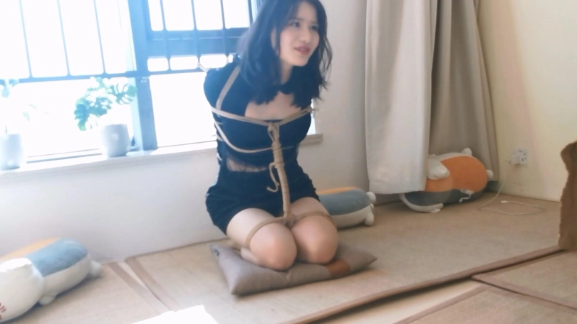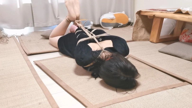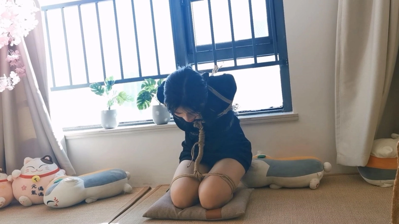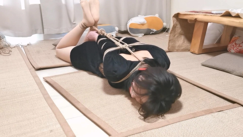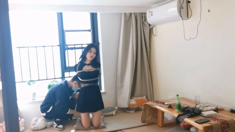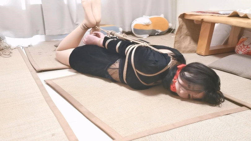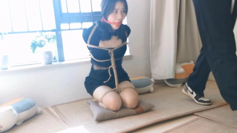 模特身材挺不错,绑起来更性感。这次是两种姿势的放置,一个是跪缚在窗边栏杆上,一个是直臂驷马紧缚,都把模特绑的够呛,还带上了大号口球,最后口球解下来的口水都在榻榻米上流了一大滩了。