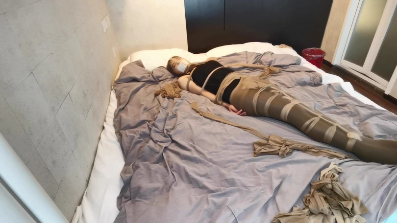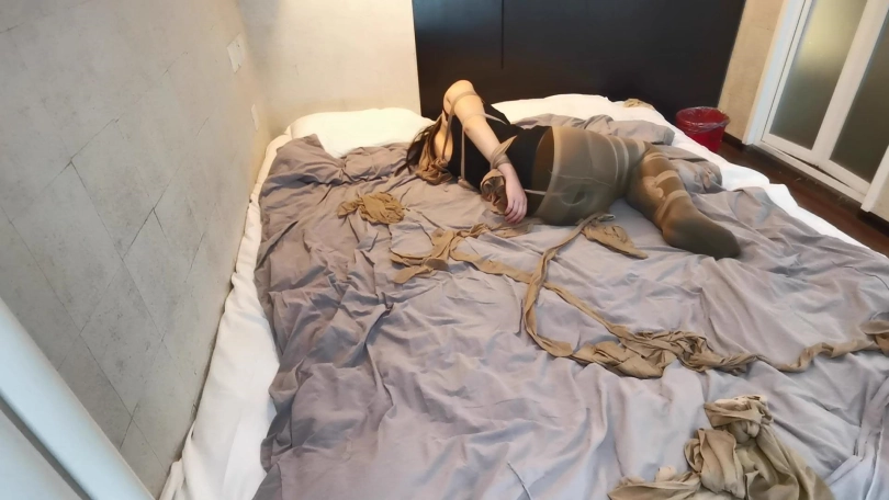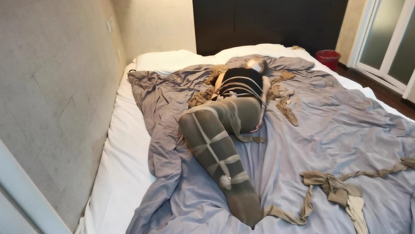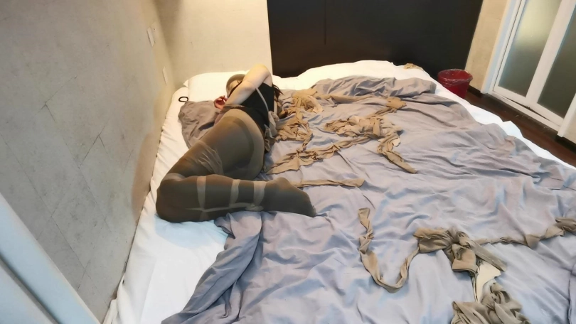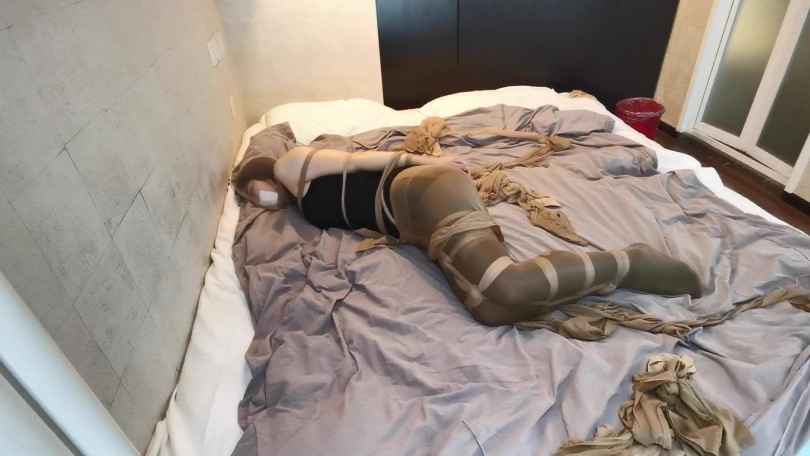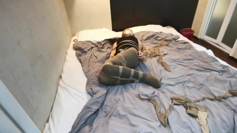 将小冷全身用丝袜捆绑起来,嘴里塞进丝袜,外面用胶布封住,再用丝袜套头。床上扔了很多丝袜,让小冷与丝袜共眠。(这次手部并没有放到身后捆,而是在绑在了腰部两侧。因为担心我会睡的很沉,万一出现意外情况,小冷嘴塞着丝袜叫不出来,可以挣脱手上的束缚自救。但腿上丝袜捆绑的还是比较紧的。这么长的时间没有丝毫松动。)