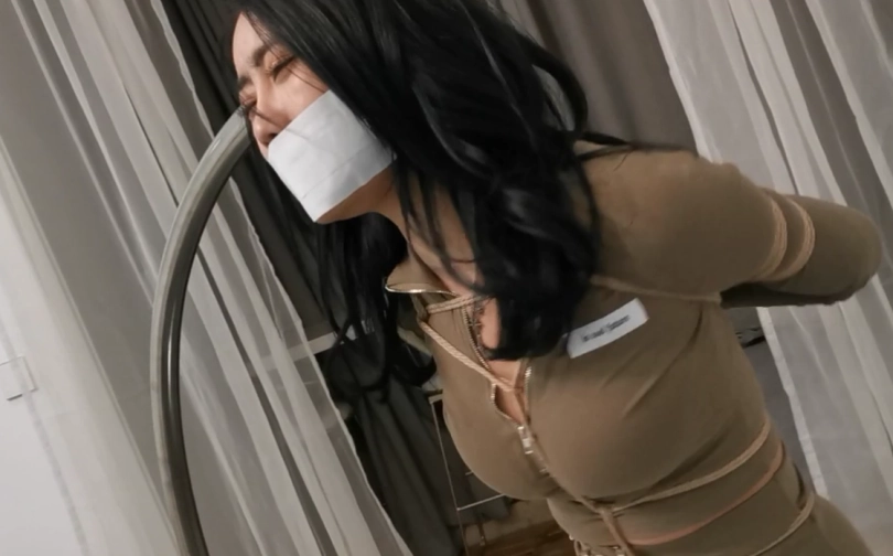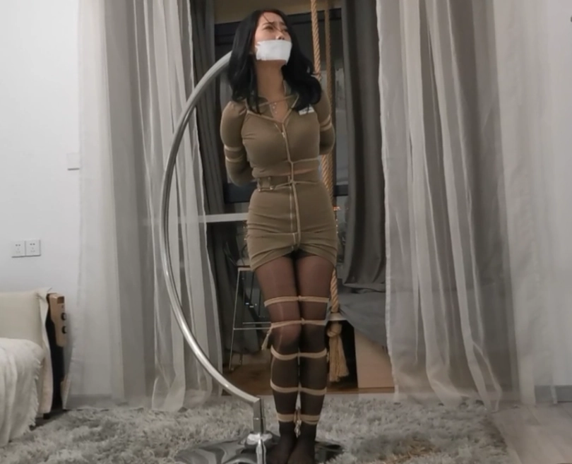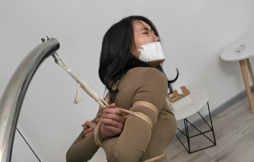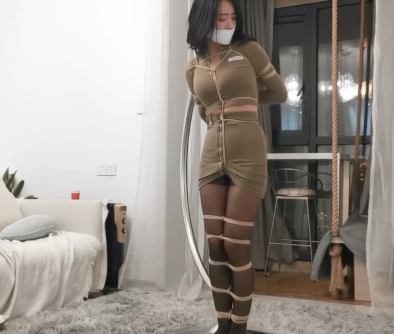 第三幕:挣扎了好一会,小丁告诉自己要冷静下来,只有线冷静下来。才有逃走的机会。小丁开始观察自己的状况(画外音:该死的,到底是谁在恶作剧,恶作剧也不用绑的这么紧吧,我真的被绑架了吗?手腕好像没有活动的空间。双腿…天啦,给我从大腿到脚踝绑了七八道,绳子都勒进肉里面了。等等…,我嘴里好像还有什么东西,似乎是一双丝袜…,天啊,好恶心!我现在是被一根绳子吊在后面了。我得先尝试解开这一段绳子,才有机会逃出去)小丁开始尝试解开把自己吊起来的那根绳子。