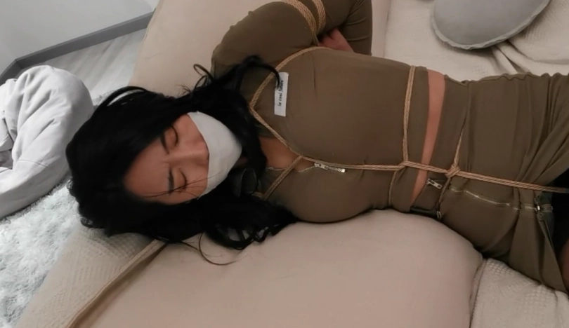 第五幕:小丁又开始,挣扎起来。她想先解开双脚,但是,发现自己够不到(画外音:这种捆绑程度,神仙才结的开。)一番挣扎后,小丁发出绝望的呜呜声。逐渐累了,开始睡了过去