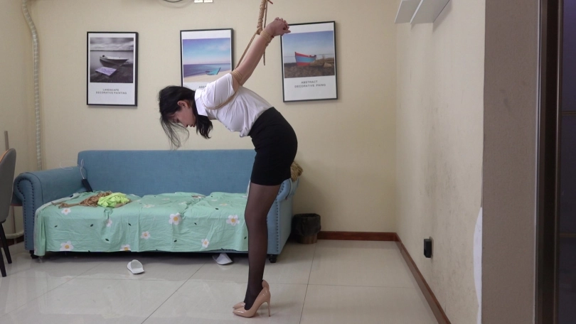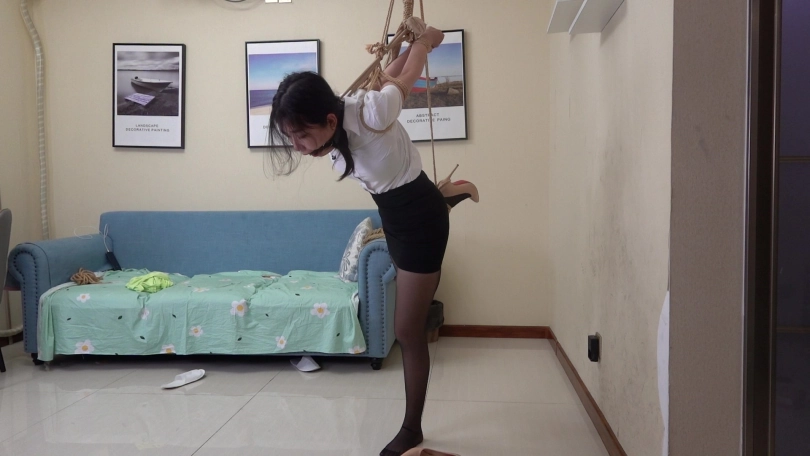 嫩模清扬身穿性感职场服装,包臀短裙搭配性感黑丝,演绎职场美女很是性感,尝试多种吊缚姿势,直臂曲臂,单腿吊缚,狠心的老板哥哥在单腿吊缚时还把清扬的鞋给脱掉了,赤足踮脚被狠狠吊缚,又几乎失去平衡的清扬只能痛苦的忍受