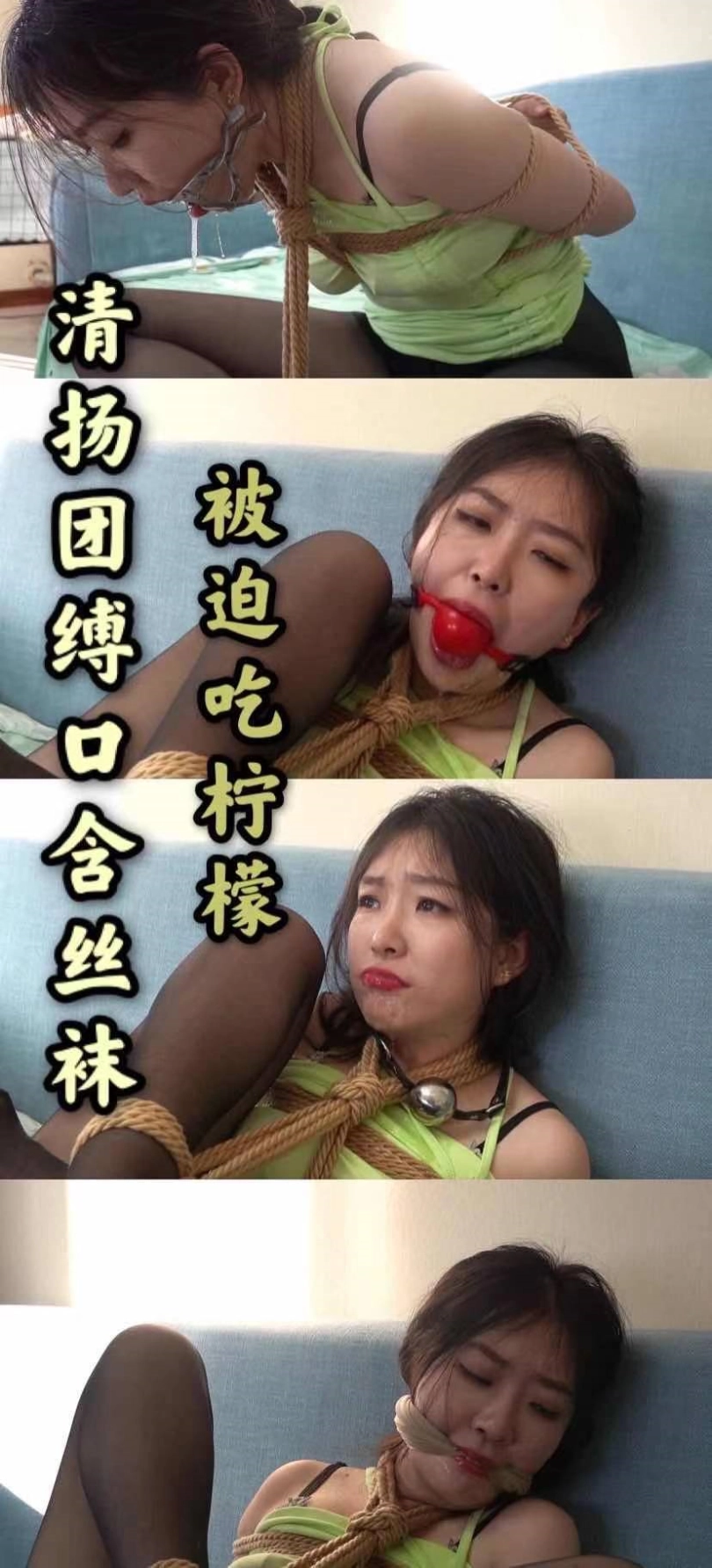 清扬妹妹尝试欧美辣妹风格的荧光色短裙,搭配黑色丝袜很是性感,这次一次性轮番尝试了各种大小的口球和张口器,叔叔给她喂了很多柠檬,口水多到惊人,湿透胸前,又渗到内衣里,叔叔把清扬穿过的丝袜放到她自己的嘴里,羞耻难当,没有前戏的纯干货,直接团缚,放置时长高达四十分钟,痛苦呻吟叫声不止!
